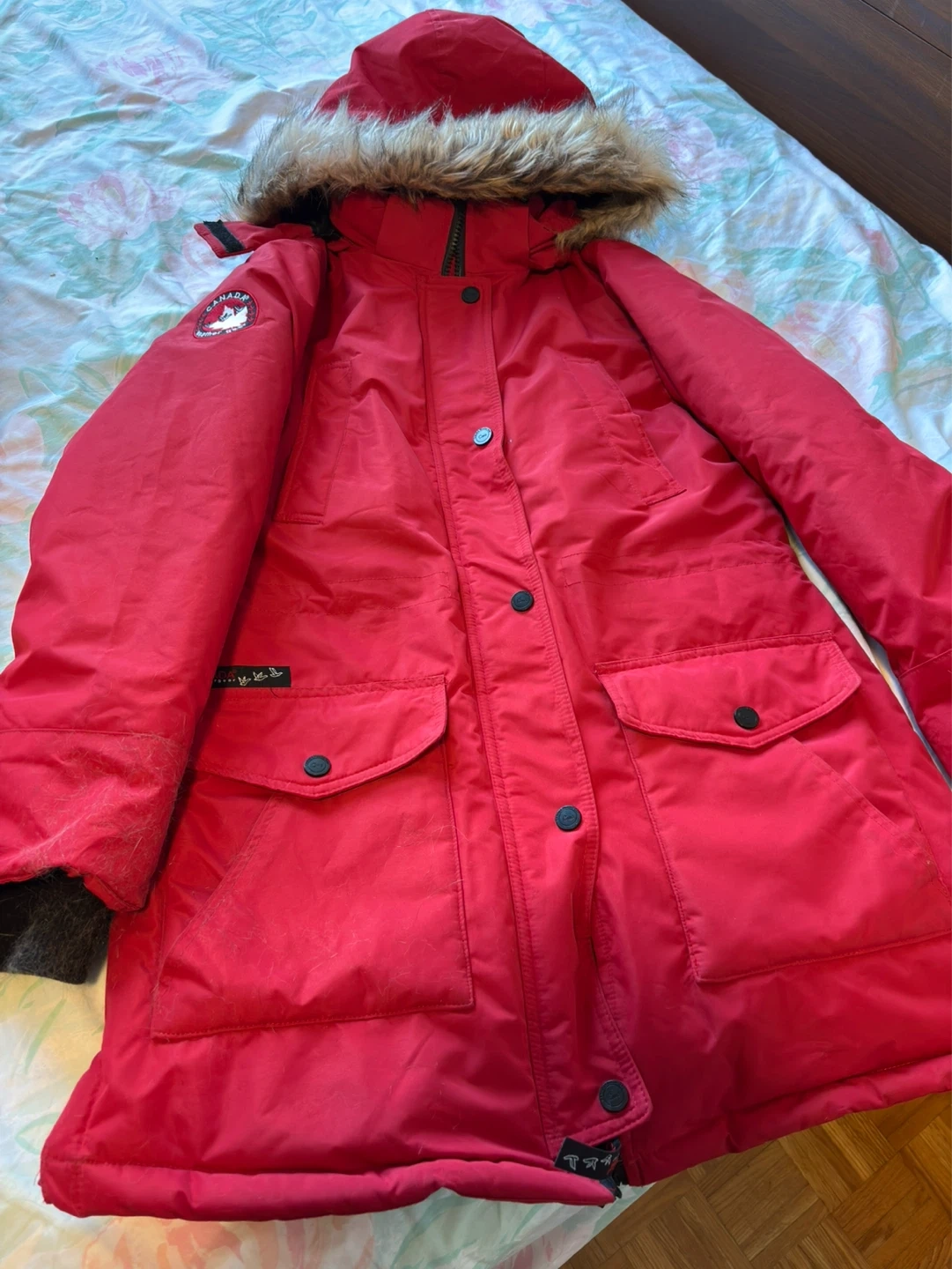 This is a vibrant red puffer winter jacket from Canada Goose. It features a cozy fur-lined hood, multiple front pockets, and a durable exterior. Perfect for staying warm during cold Canadian winters!