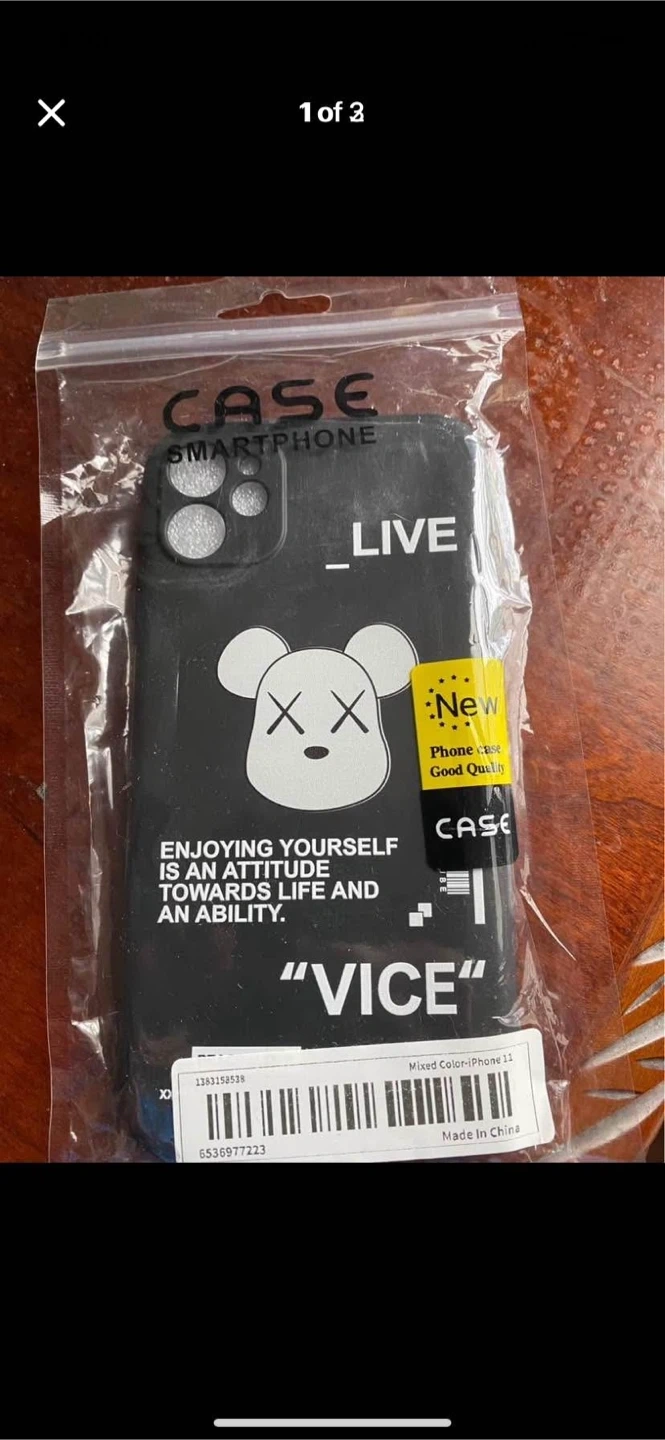 This is a black phone case for an iPhone 11. It's made by CASE SMARTPHONE LIVE and features "VICE" text and a graphic design. The case is in mixed colour and was made in China.