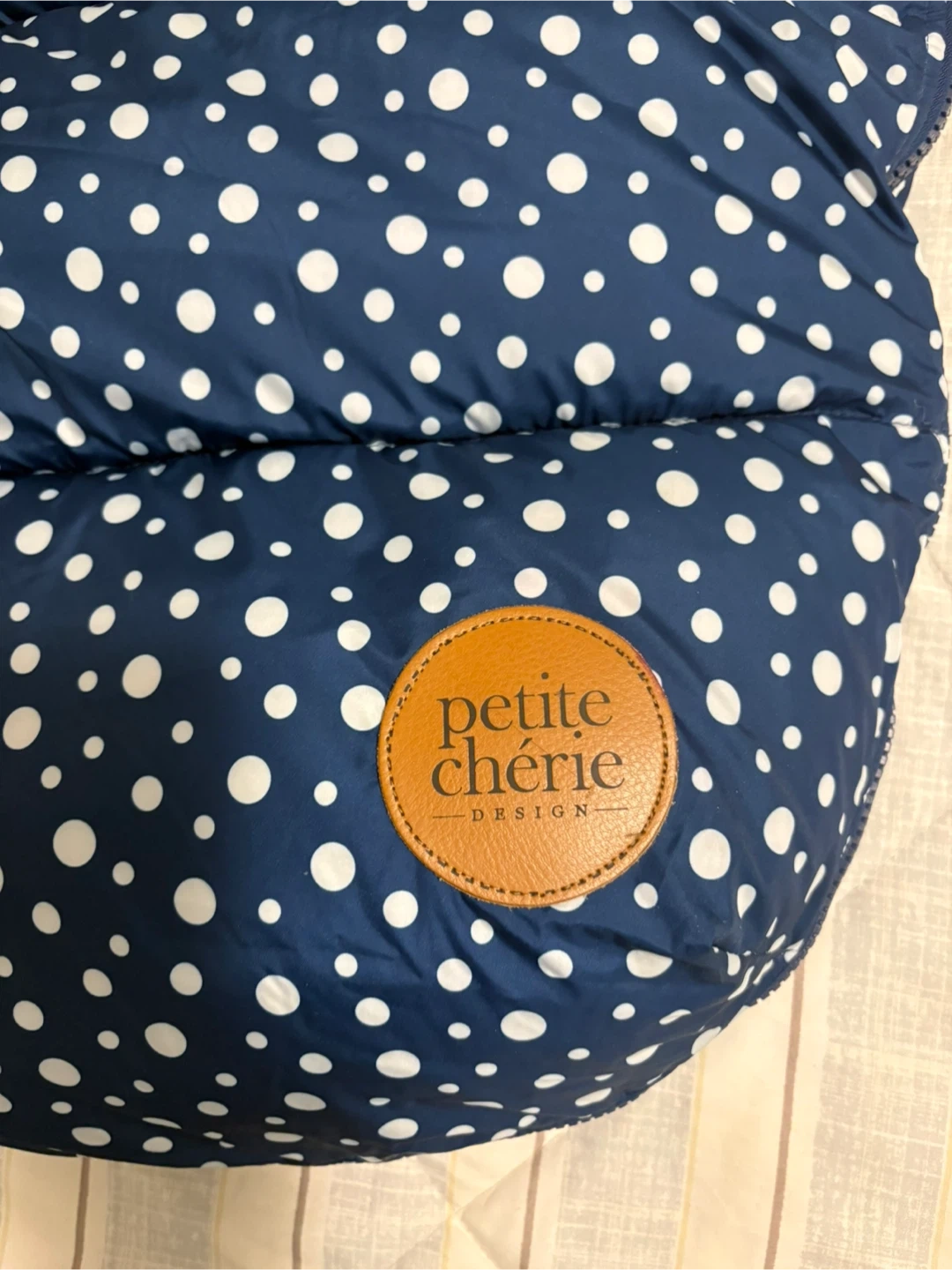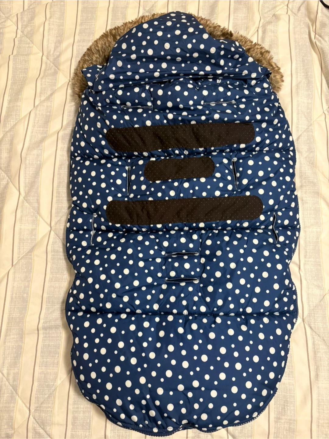 Stay warm this winter with this adorable navy polka dot bunting bag from Petite Chérie. It features a cozy fleece lining and a faux fur-trimmed hood. Designed for stroller or car seat use with built-in harness openings.