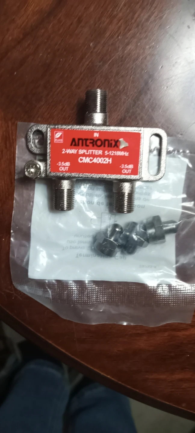 This is an Antronix 2-way cable TV splitter. It supports a frequency range of 5-1218MHz. Each output has a -3.5dB insertion loss. It's made of metal and includes some small adapters.