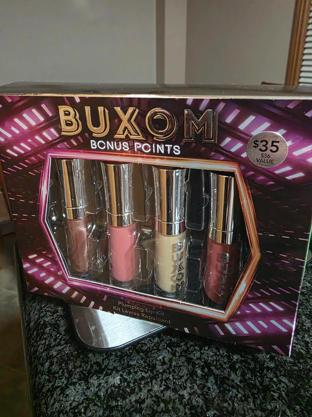 This is a Buxom Bonus Points Plumping Lip Kit. It includes four mini lip glosses in various shades. These lip glosses are known for their plumping effect.