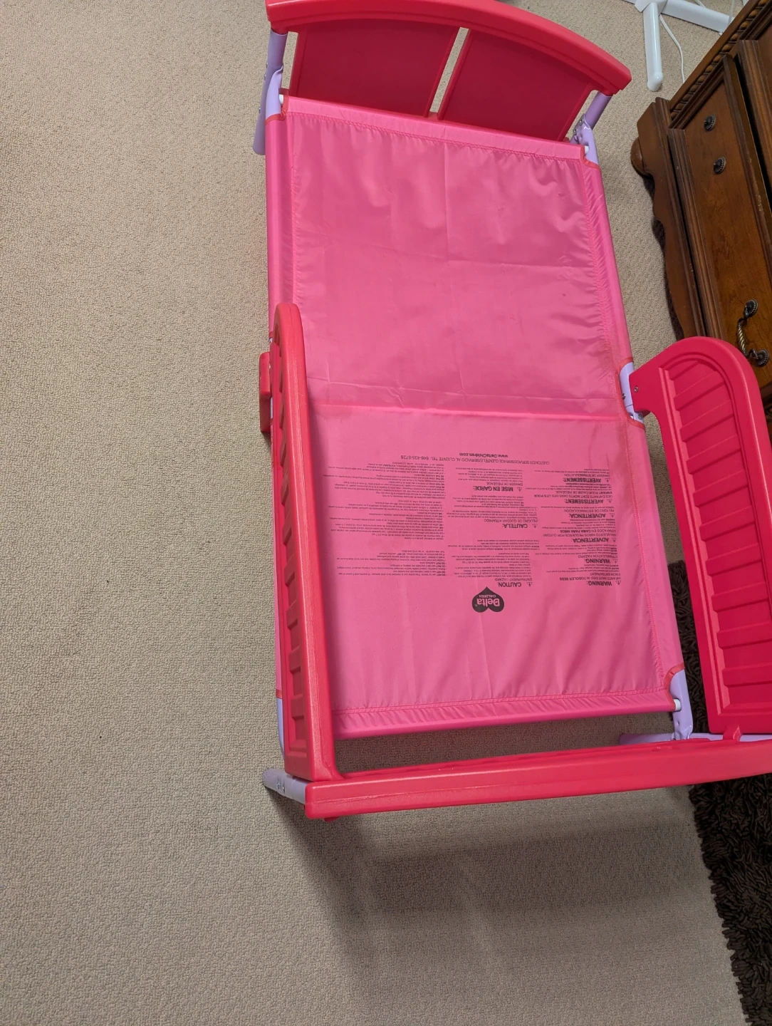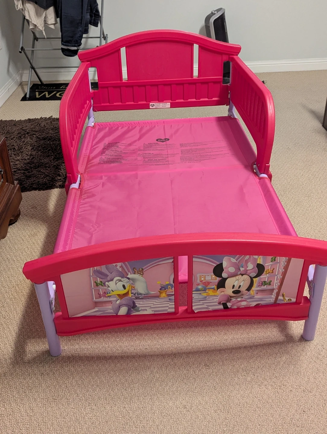 This is a pink Disney Minnie Mouse toddler bed featuring Minnie and Daisy. It has safety rails on the sides. The bed frame is made of plastic.