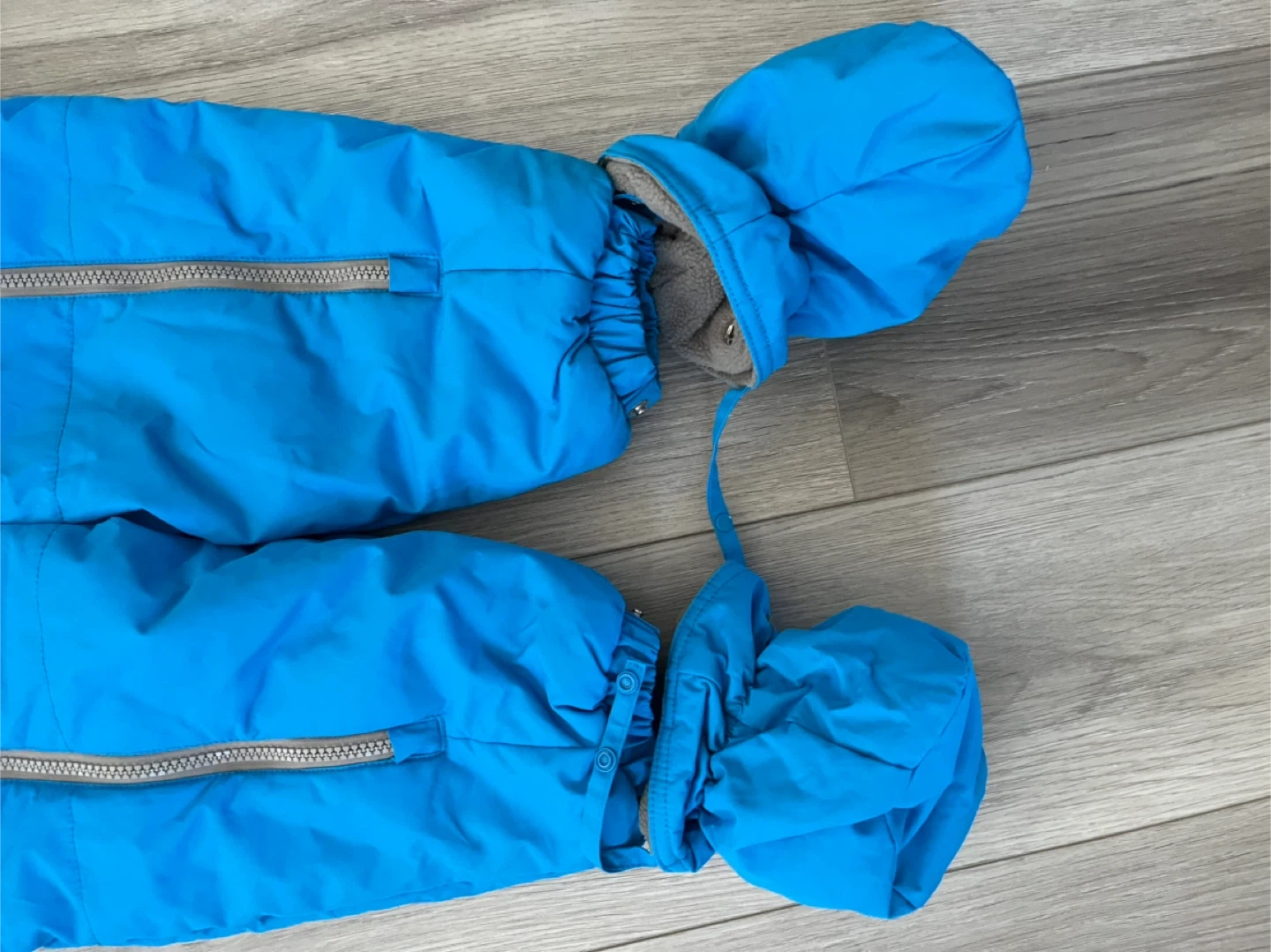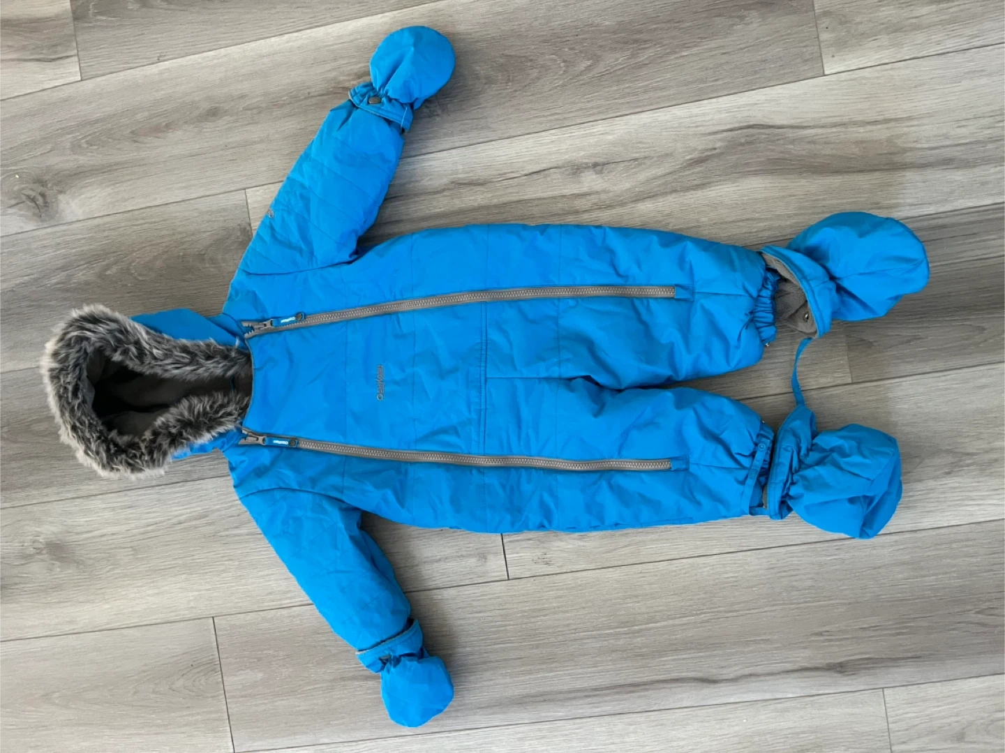 Keep your little one warm this winter with this adorable blue snowsuit! It's in great condition and ready for snowy adventures. The snowsuit features a cozy hood and attached mittens and booties to keep your child snug from head to toe.