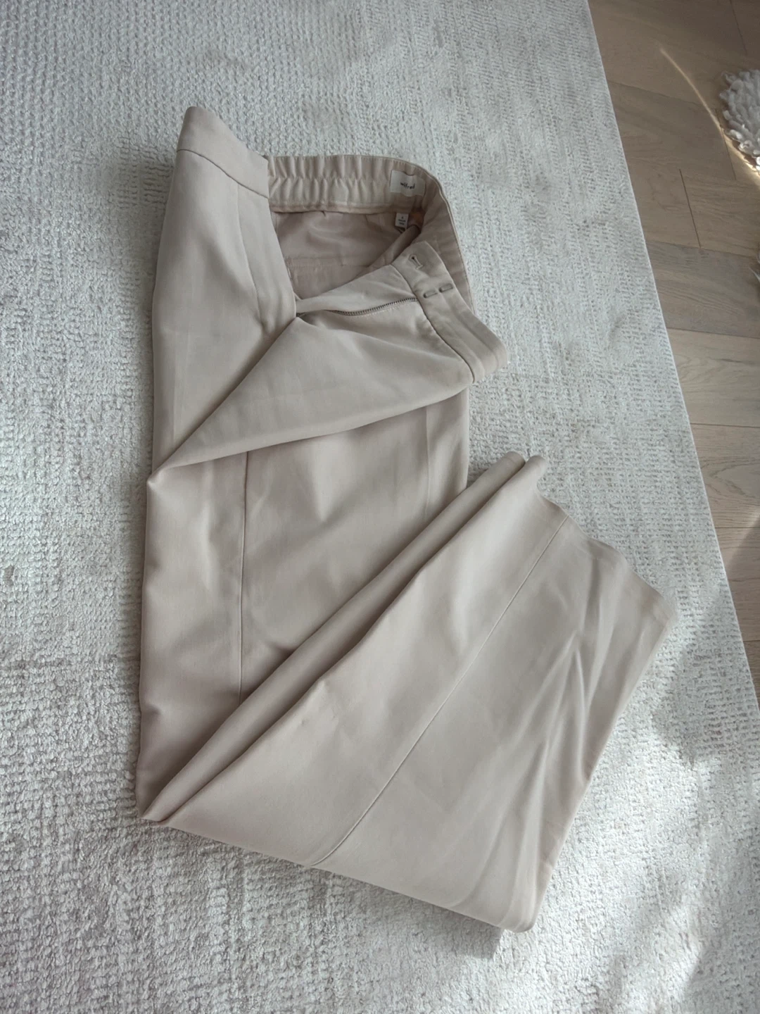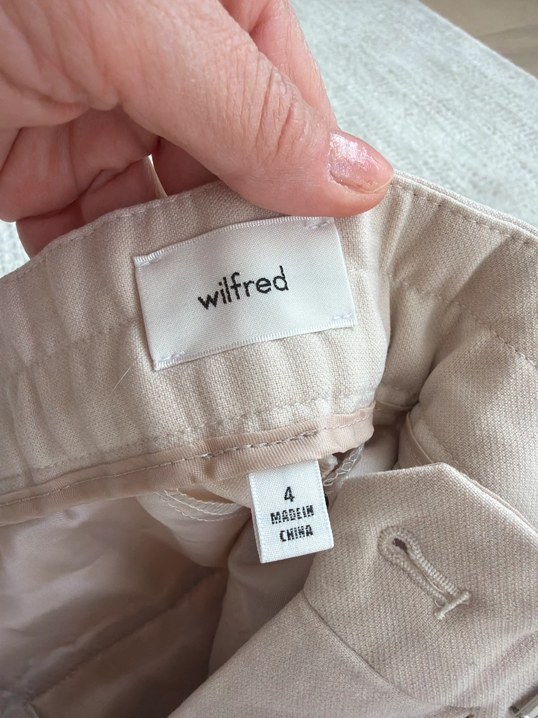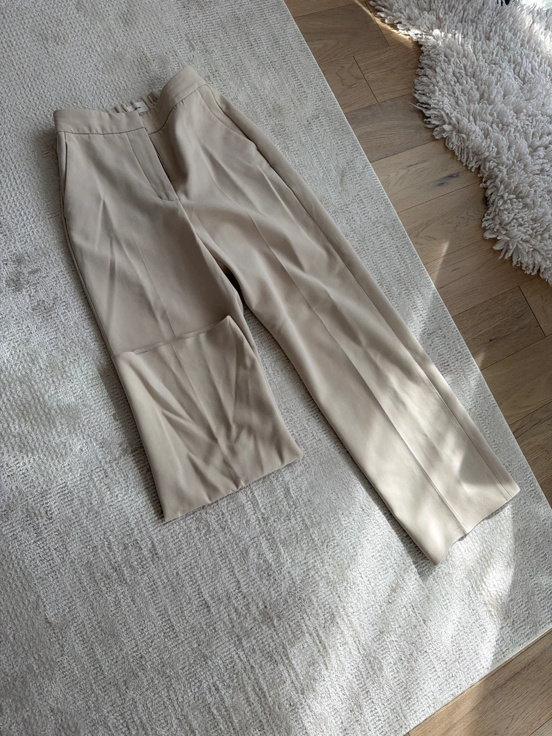 Beige Wilfred cropped trousers. Size 4. Made in China. These pants have a zip fly and elastic waistband.