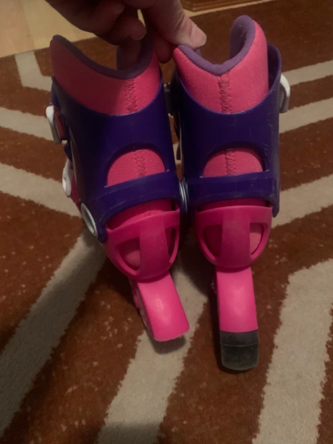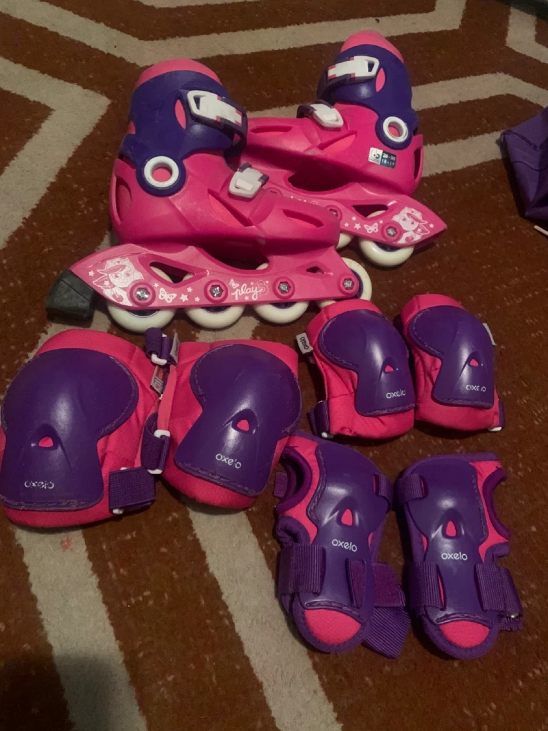 This set includes pink and purple Oxelo roller skates with adjustable sizing, suitable for children. It also comes with matching purple and pink protective gear for knees and elbows and hands. These skates are designed for beginner rollerblading adventures!
