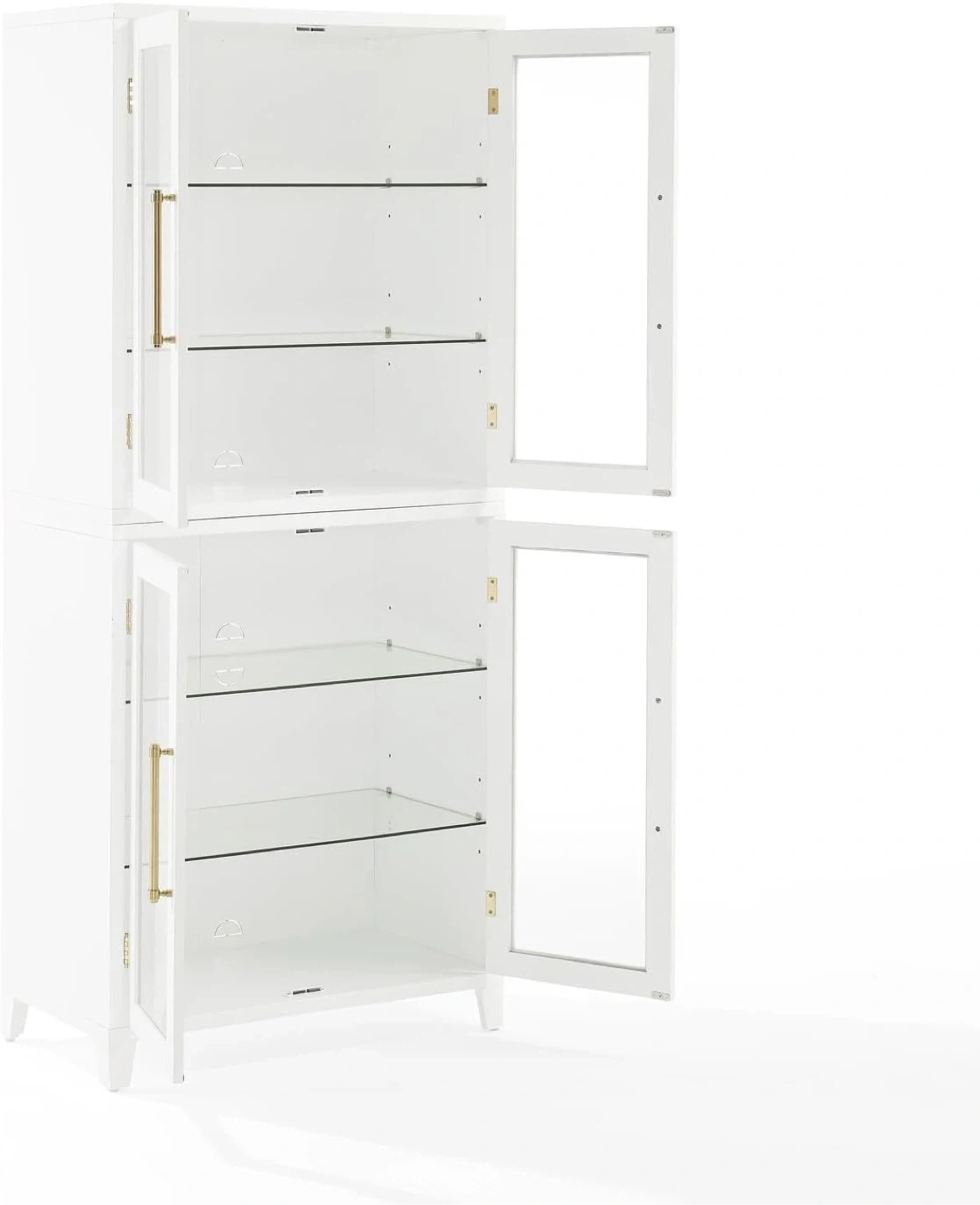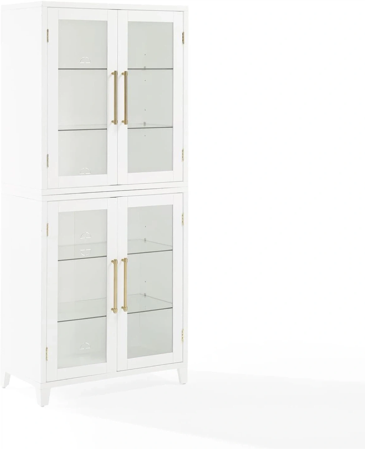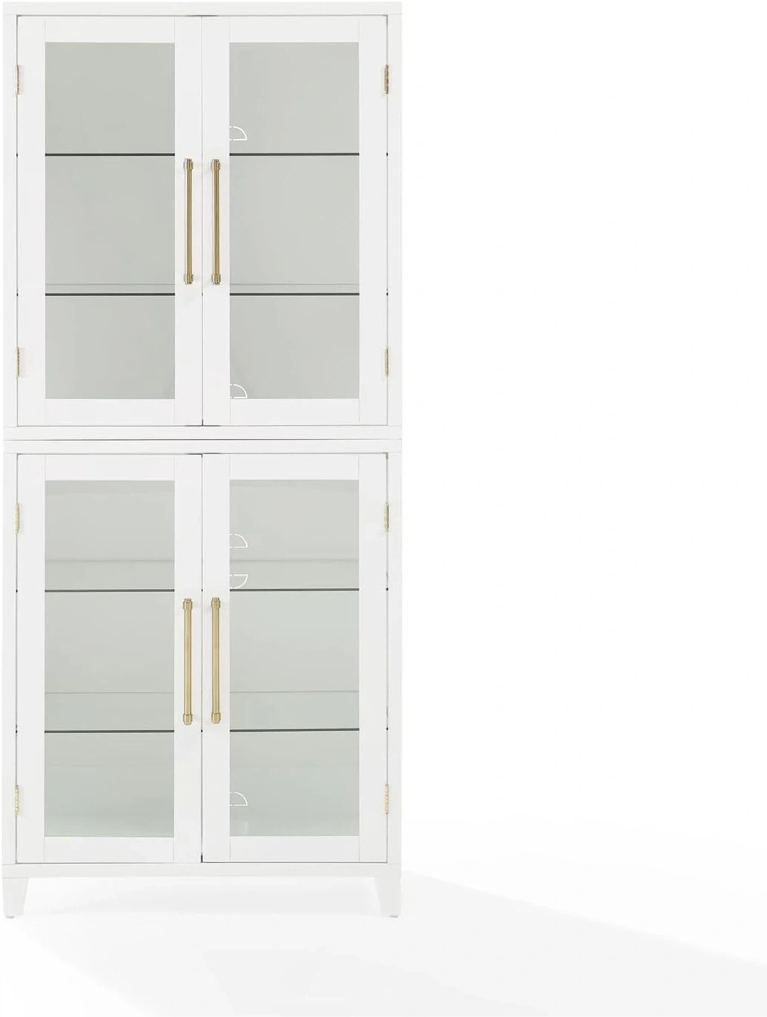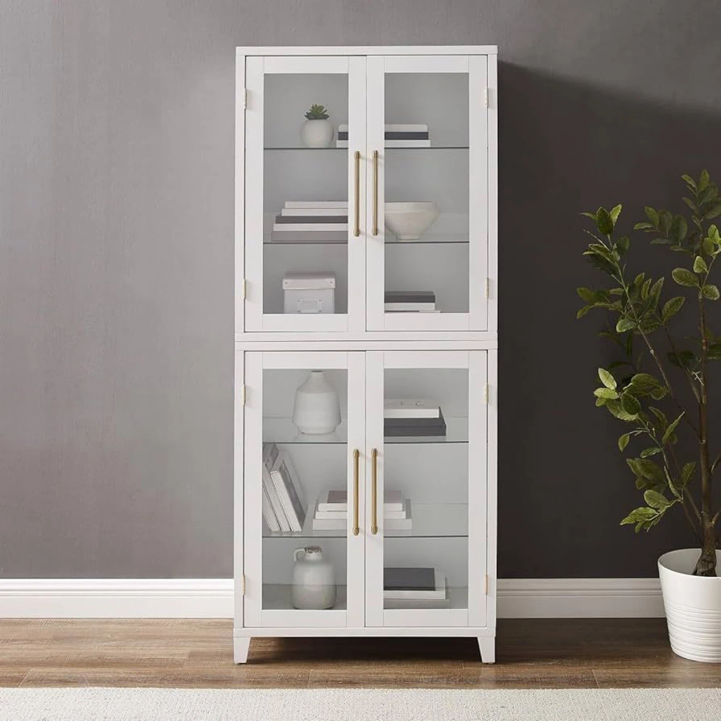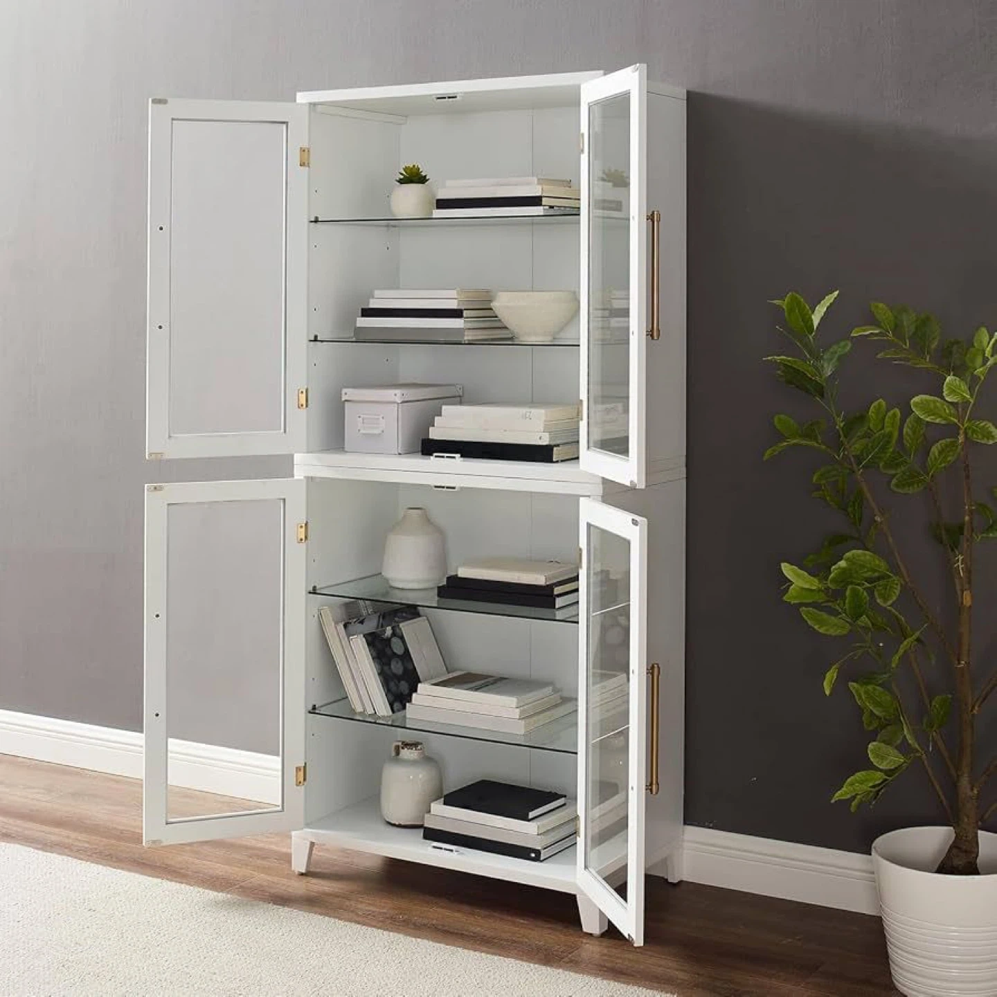 This two-tiered display cabinet features clear glass doors and gold-tone handles for a modern look. It has adjustable glass shelves for versatile storage and display. It's great for showcasing books, decor, or collectibles in any room.