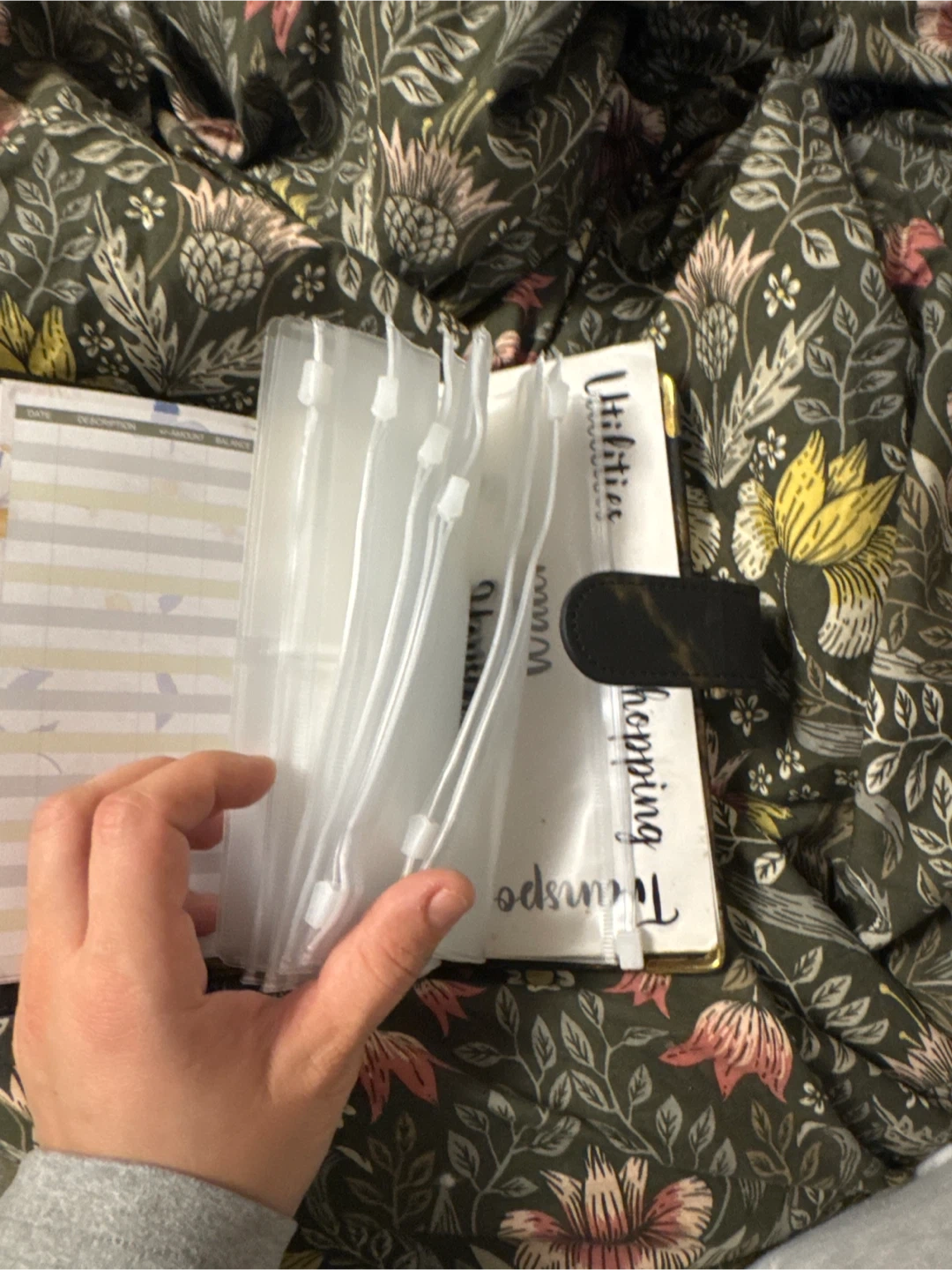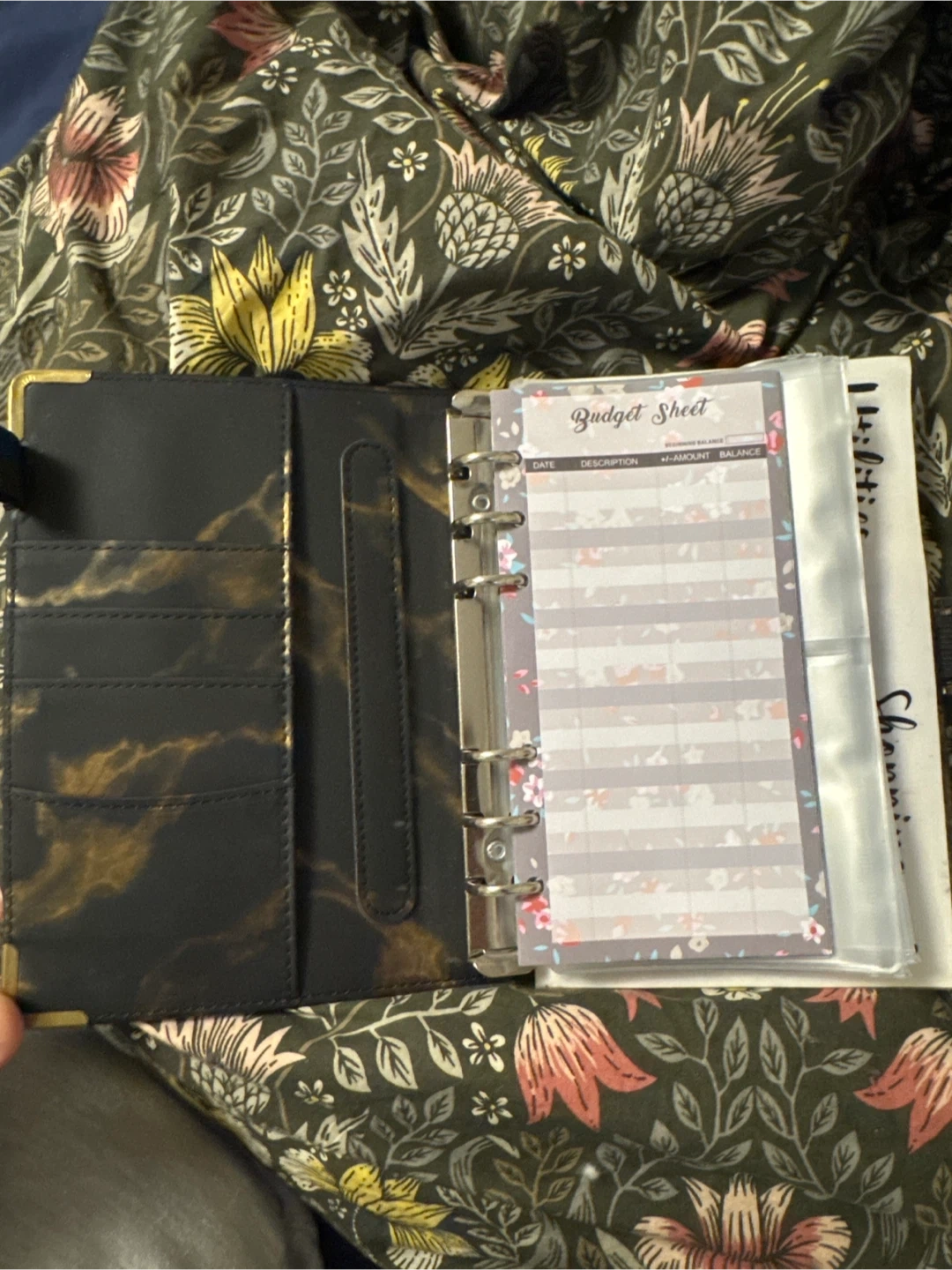 This budget binder has a stylish marble and gold exterior with a snap closure. It includes several labeled sections for various expenses, along with zipper pouches for cash. Perfect for anyone wanting to get organized with their finances!
