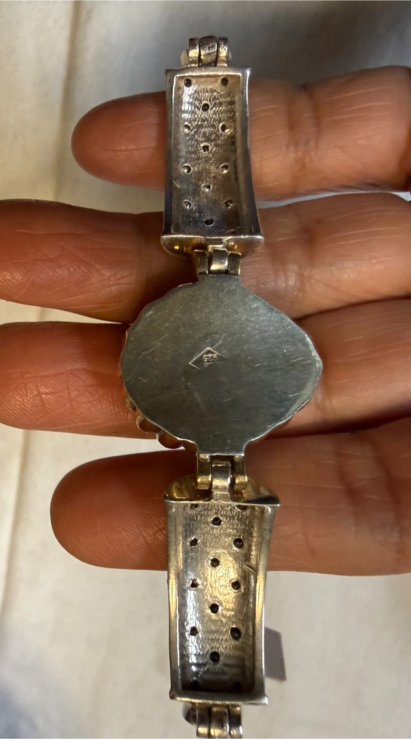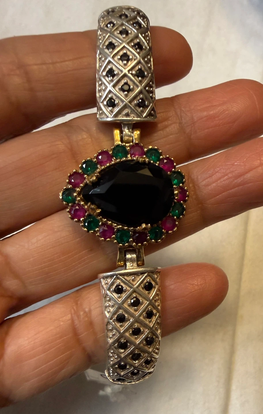 This sterling silver bracelet features a large, teardrop-shaped black dark blue stone. It's surrounded by a halo of small round red and green stones. The bracelet links have a patterned design, and it closes with a secure clasp.