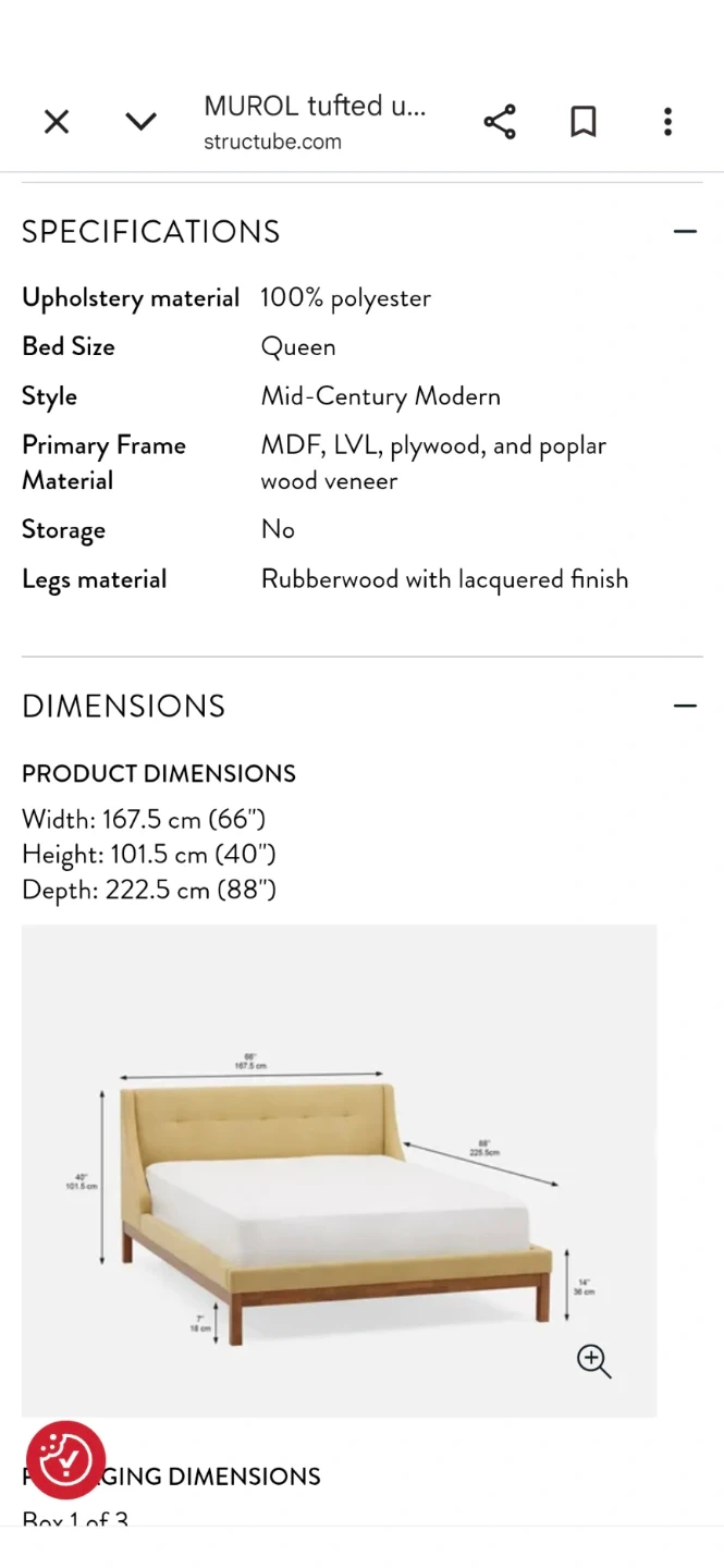 This is a Structube MUROL queen bed with a mid-century modern style. It's upholstered in 100% polyester and features a tufted wingback headboard. The primary frame is MDF, LVL, plywood, and poplar wood veneer, with rubberwood legs. Bed dimensions: 167.5 cm (W) x 101.5 cm (H) x 222.5 cm (D).