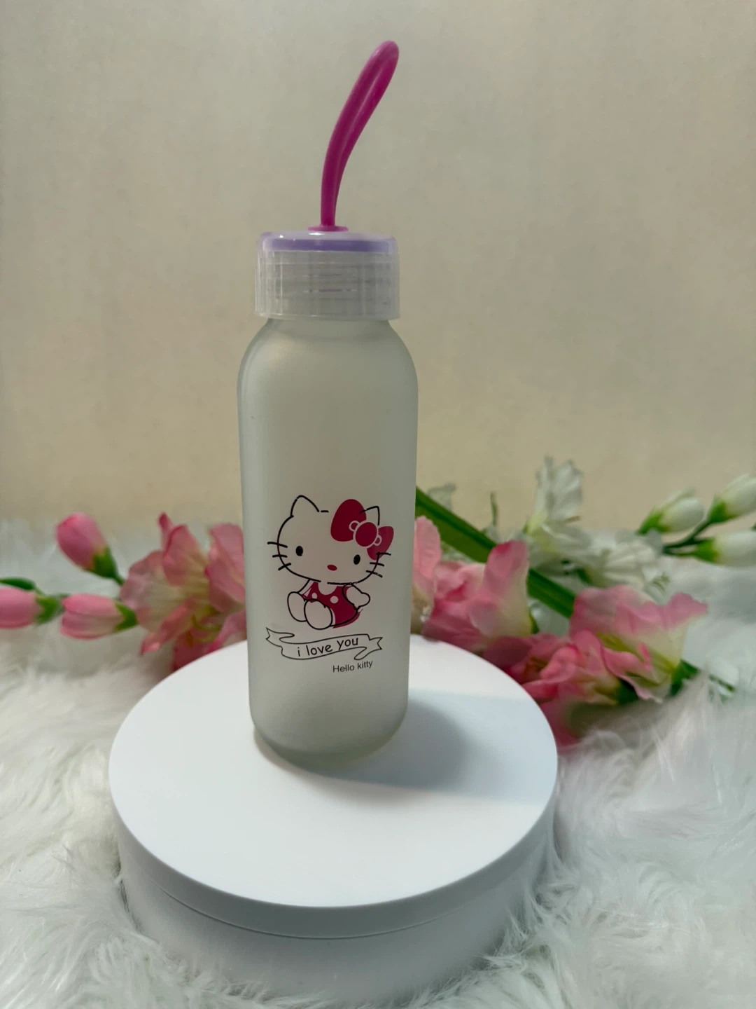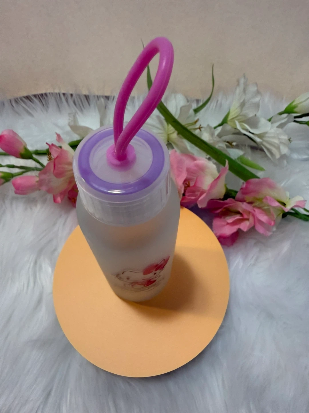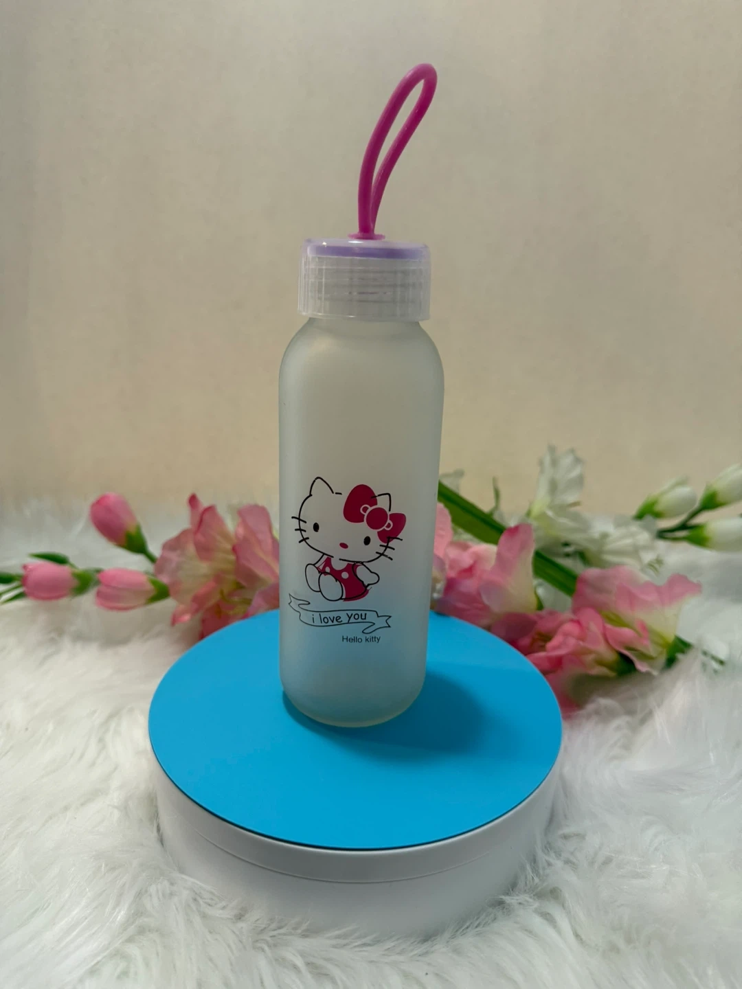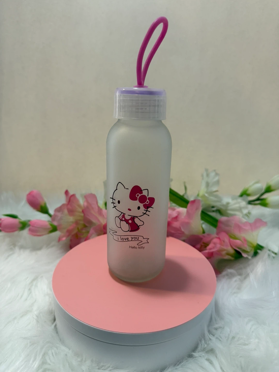 This is a frosted glass water bottle featuring Hello Kitty. It has a pink loop attached to the lid for easy carrying. It's great for on-the-go hydration!