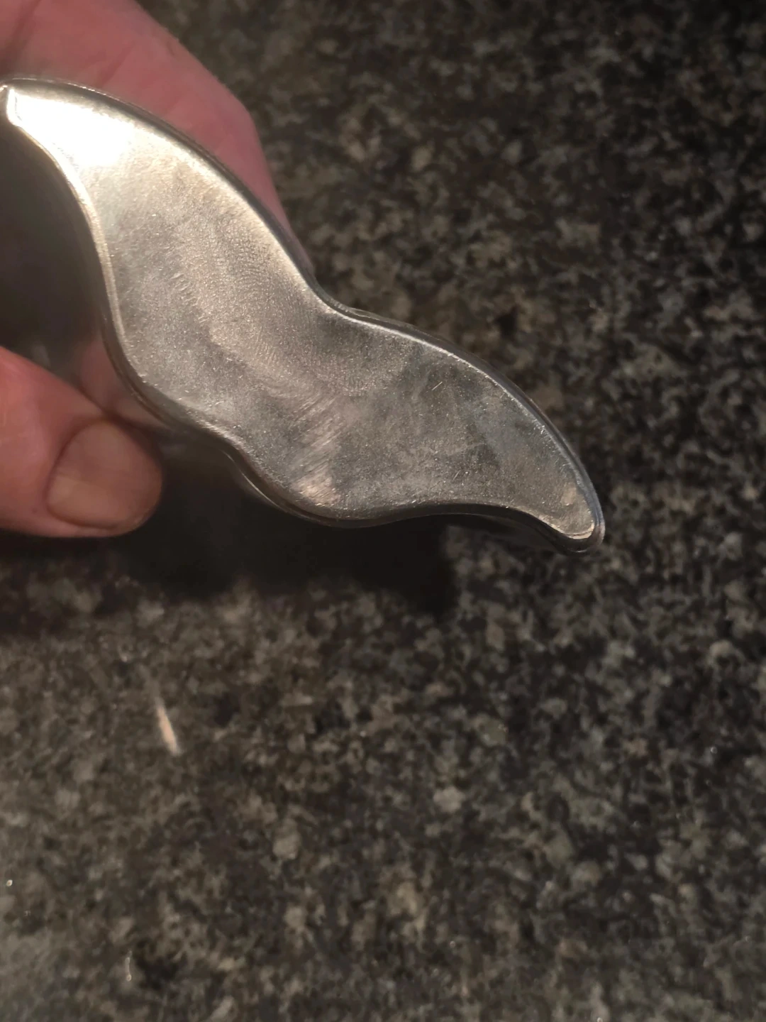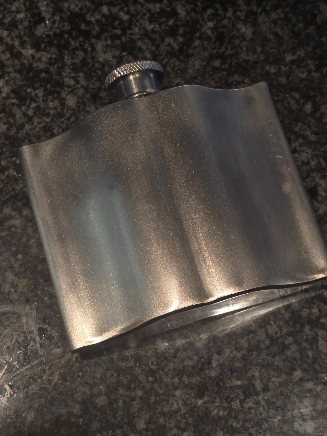 A Dr. McGillicuddy's stainless steel hip flask. It's shaped like a whale's tail. The flask has a screw-on cap. Believe it is 8 Oz.