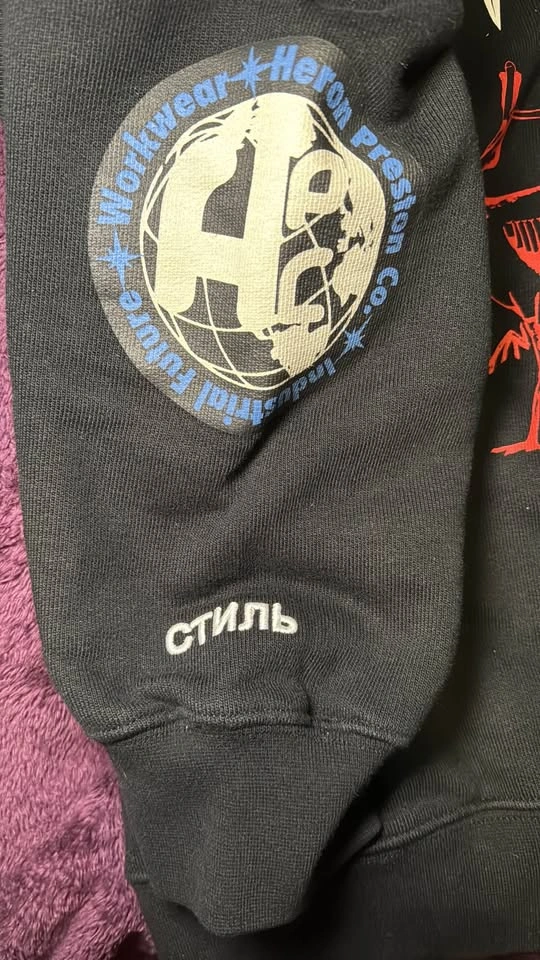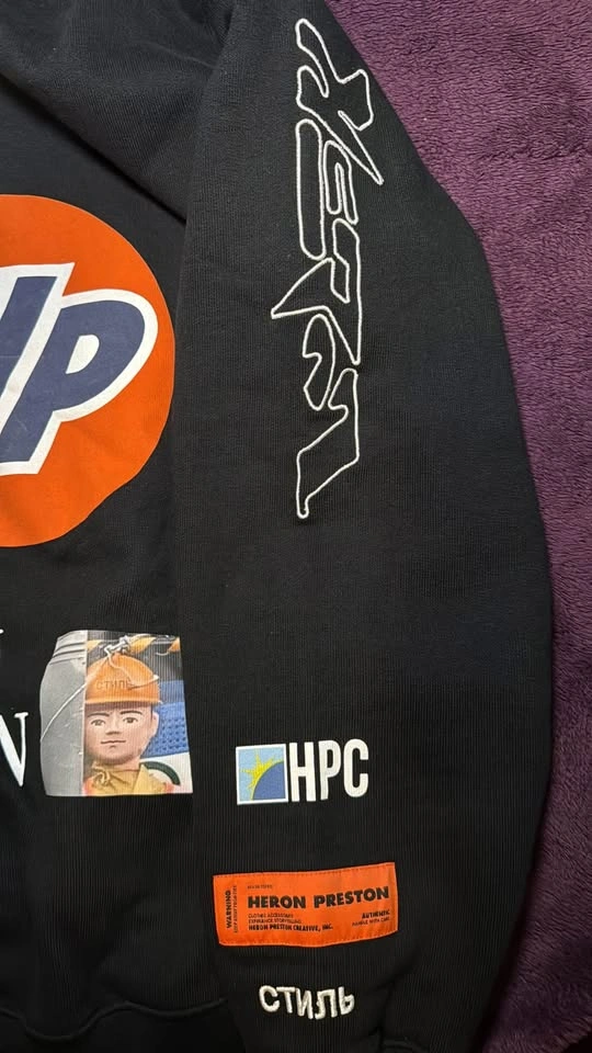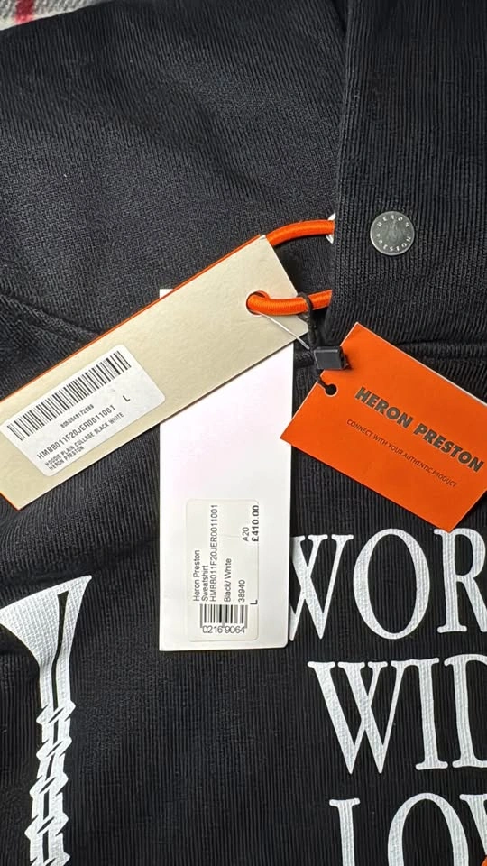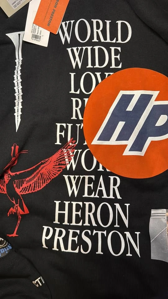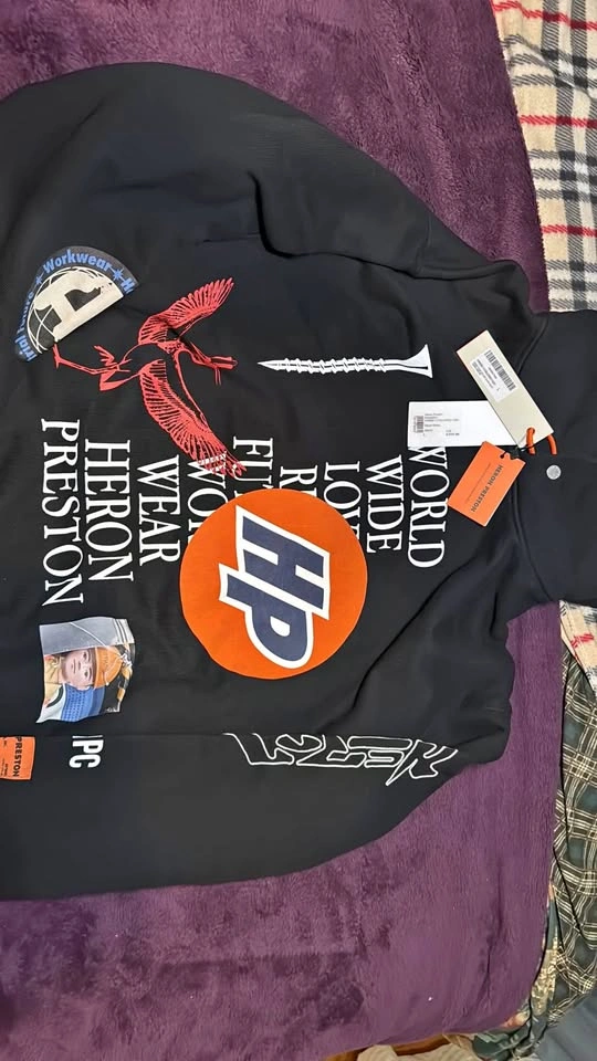 I'm selling a brand new Heron Preston hoodie in size Large, featuring a plain collage design in black and white. This high-quality hoodie showcases unique graphics and the signature Heron Preston style. Perfect for adding a statement piece to your wardrobe.