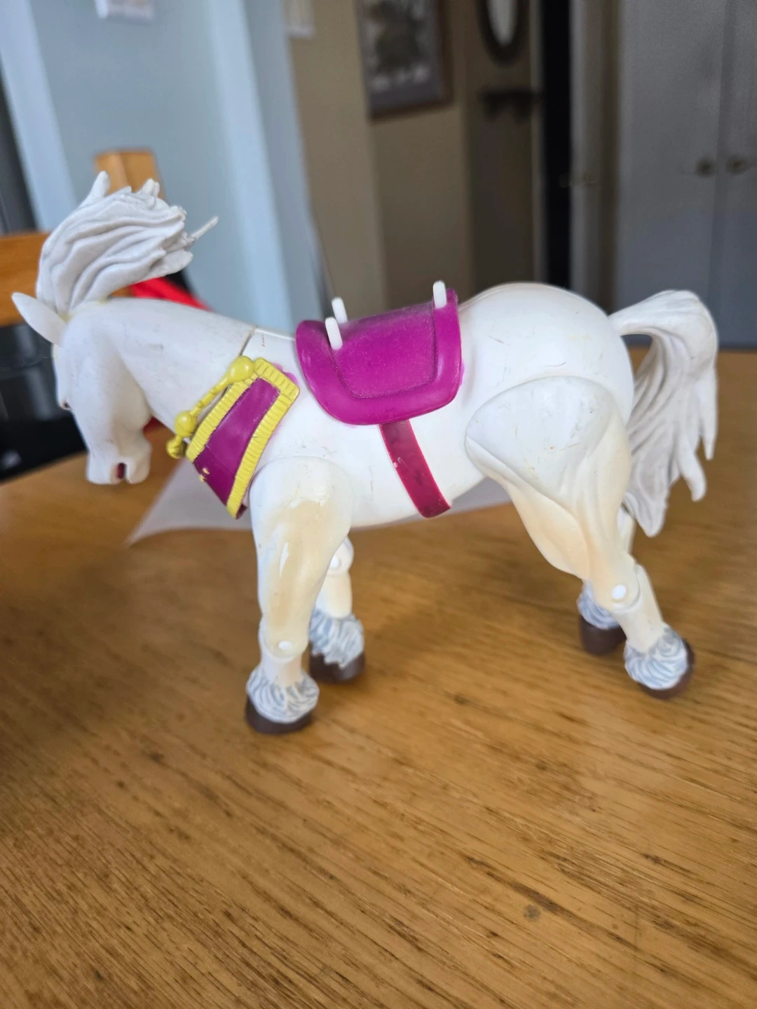 This is a Toy Biz Legend of Zelda Impa character with a white body and a purple saddle. It has decorative gold trim and a red saddle strap. The mane and tail are white. It's a good size for imaginative play.