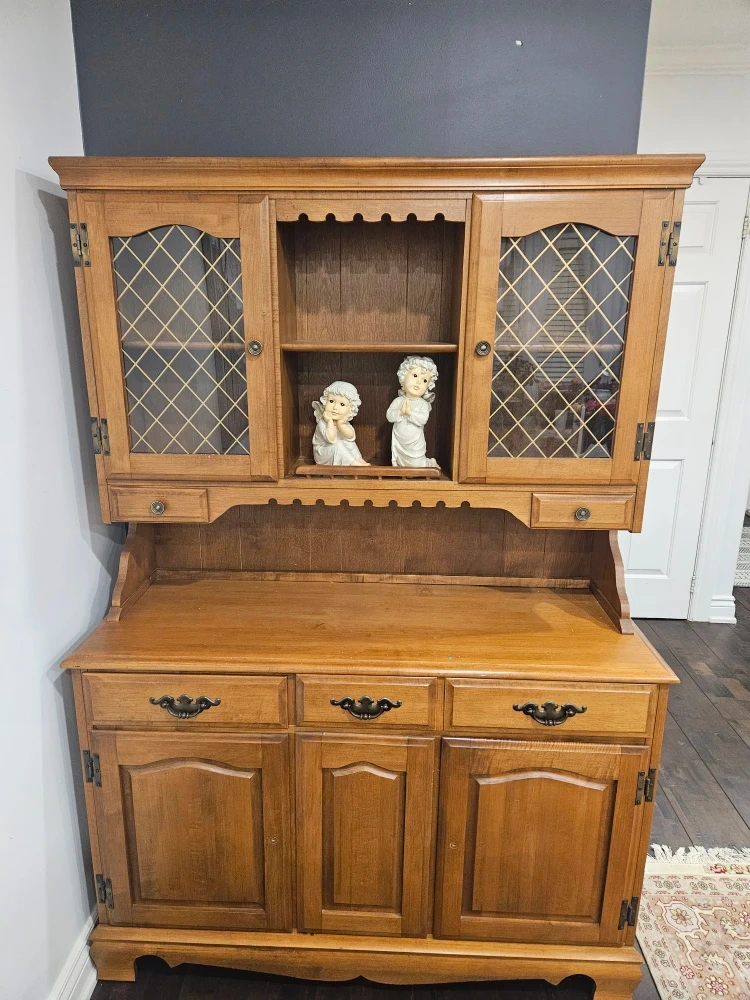 Selling a vintage real wood hutch. This piece has a classic design with glass-paneled doors and ample storage space. It would be a great addition to any dining room or living room!