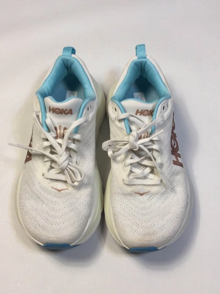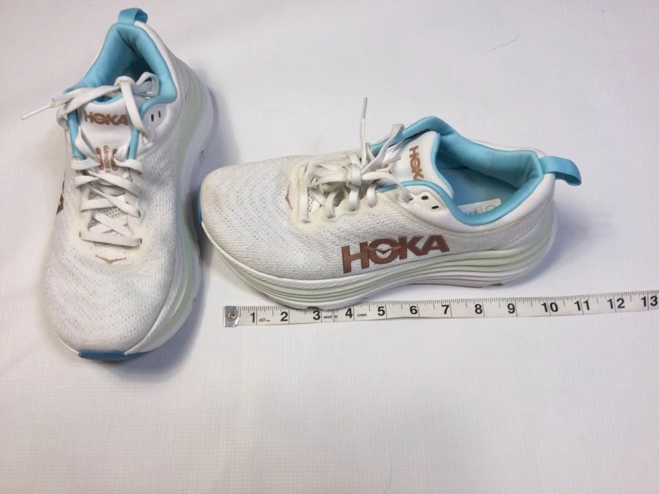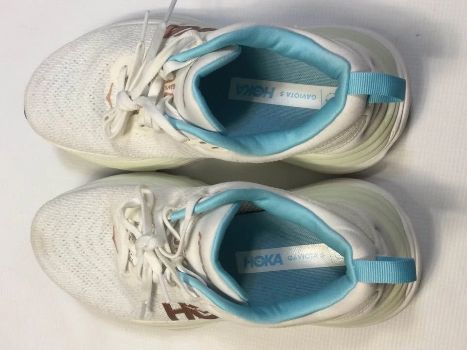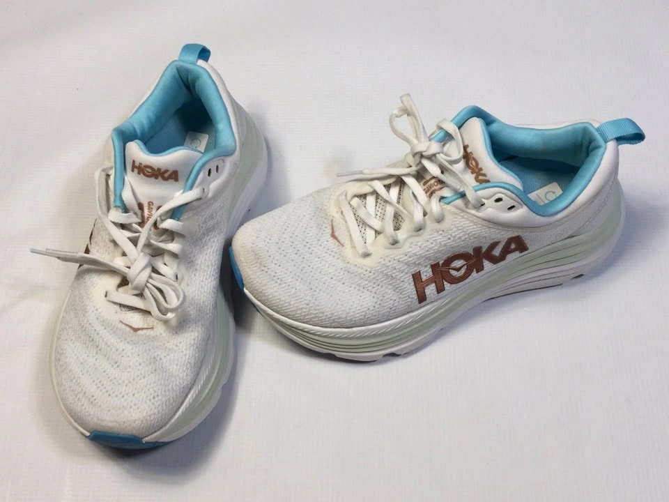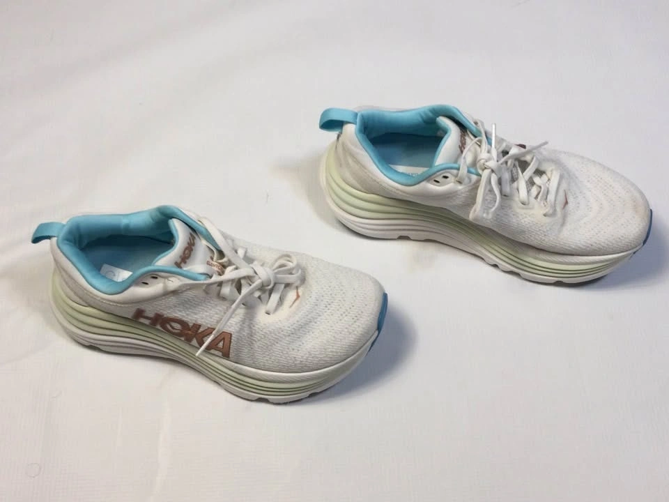 White Hoka Gaviota 5 running shoes. Women's US size 7.5. Has light blue accents. Good for walks or runs. Cash only, public meetup in Manhattan / Hell's Kitchen.