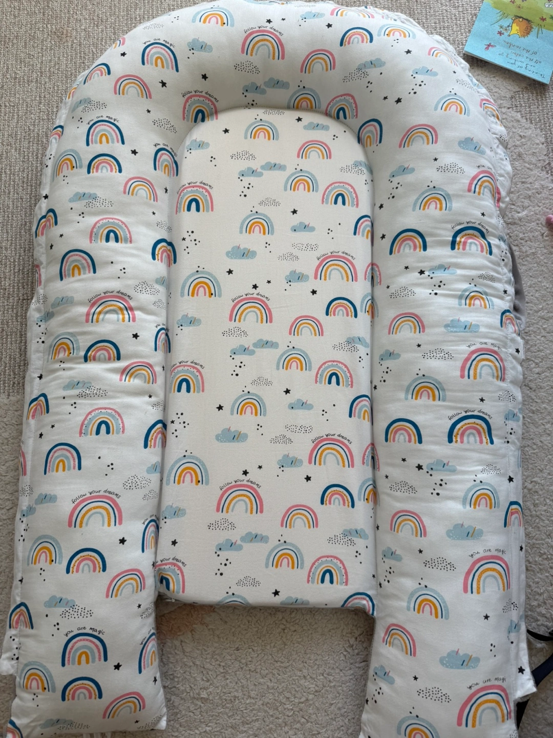 Selling a SSuperp baby nest in white with a cute rainbow pattern! It's a soft and breathable baby bed that's perfect for newborns. Originally bought for $58.66 before tax