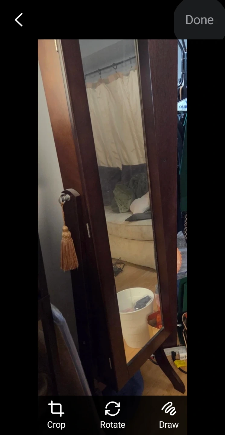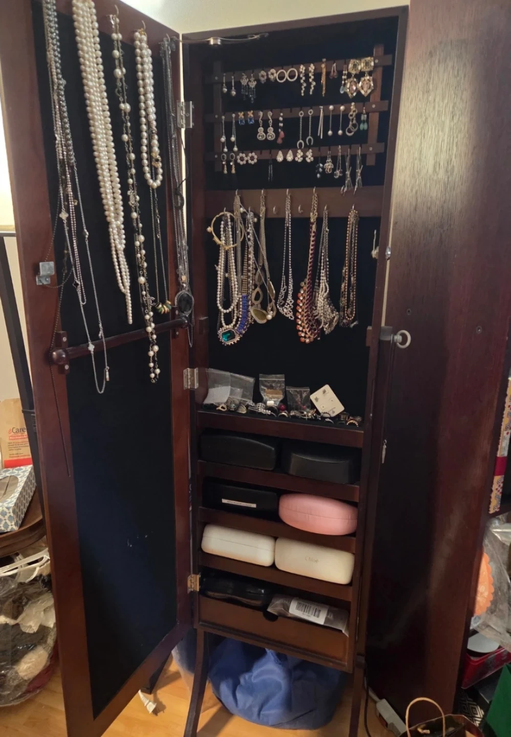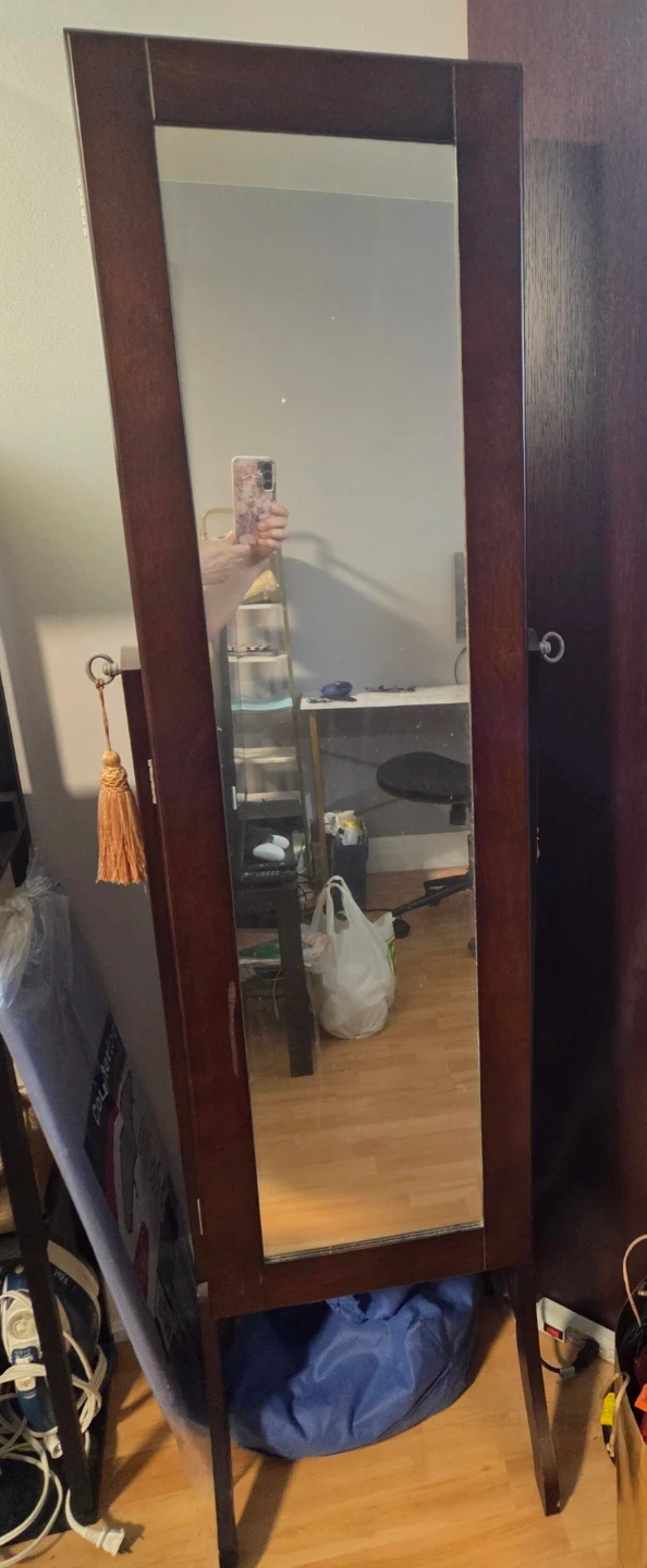A dark wood jewelry armoire with a full-length mirror. It's designed with multiple shelves and hooks to organize your accessories. Great for keeping your jewellery tidy! Very good condition.