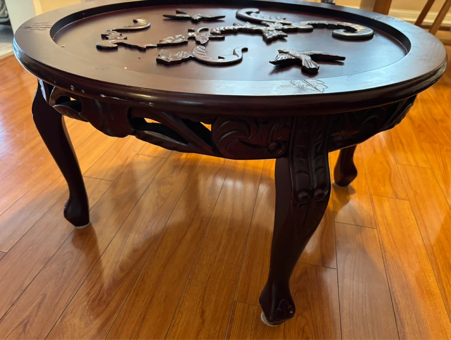 A beautifully carved dark wood coffee table in Chinese design featuring a bird and floral motif. Measurements … 30” diameter, 17” height. This round table has ornate legs and a decorative top surface. It's made of solid wood.
