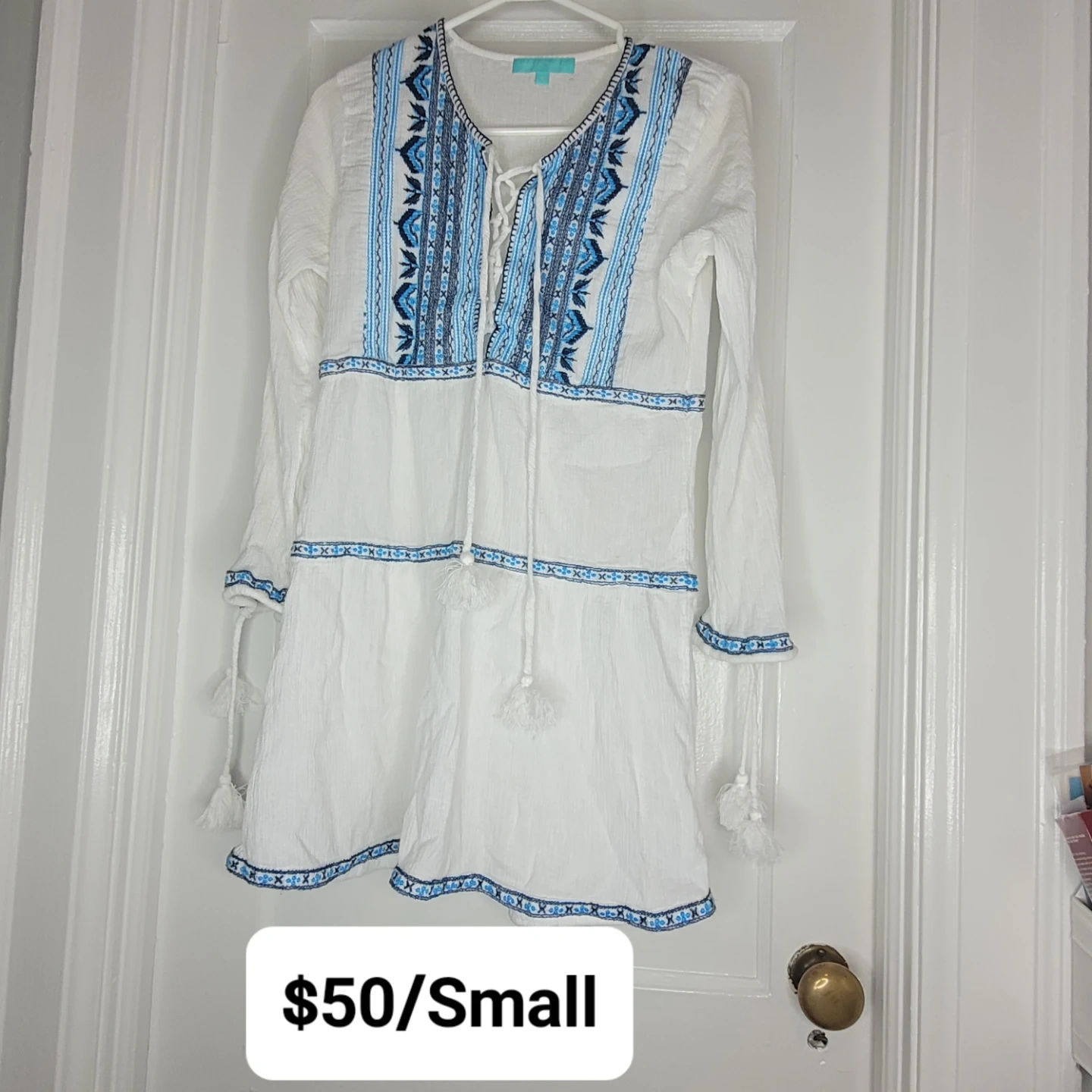White long-sleeve tunic dress with blue embroidery and tassel details. Size is small. This dress is perfect for a beach vacation or casual summer wear!