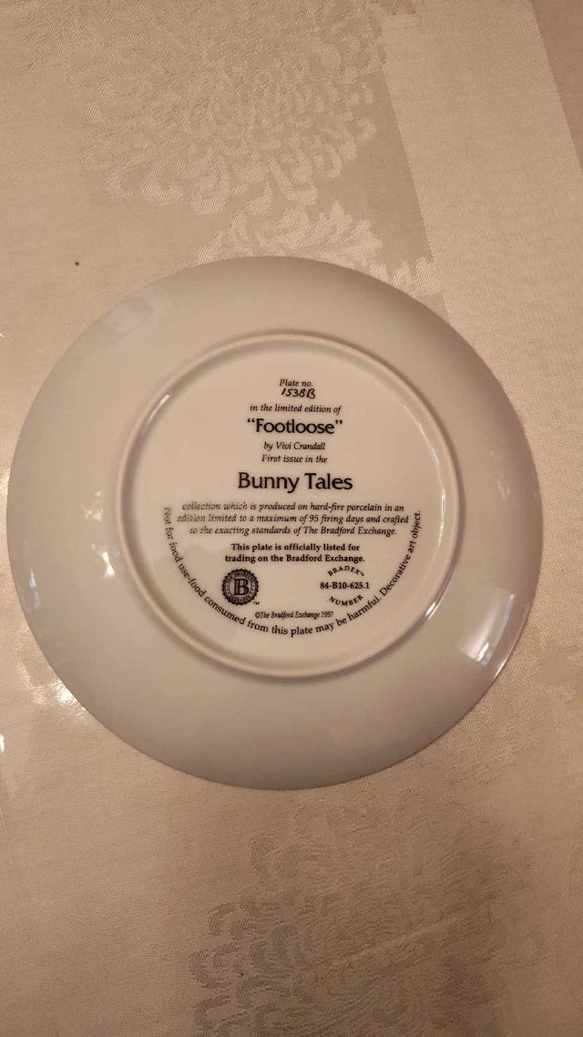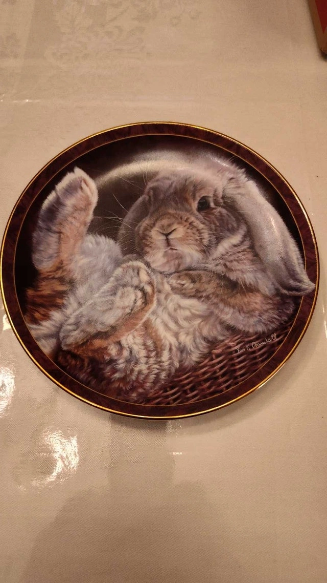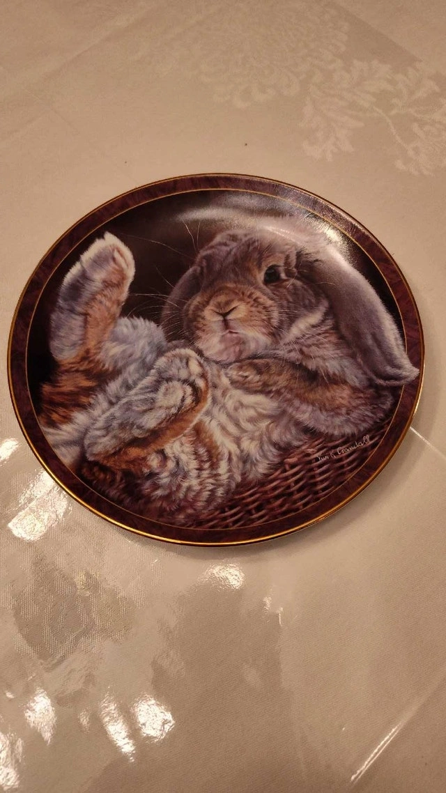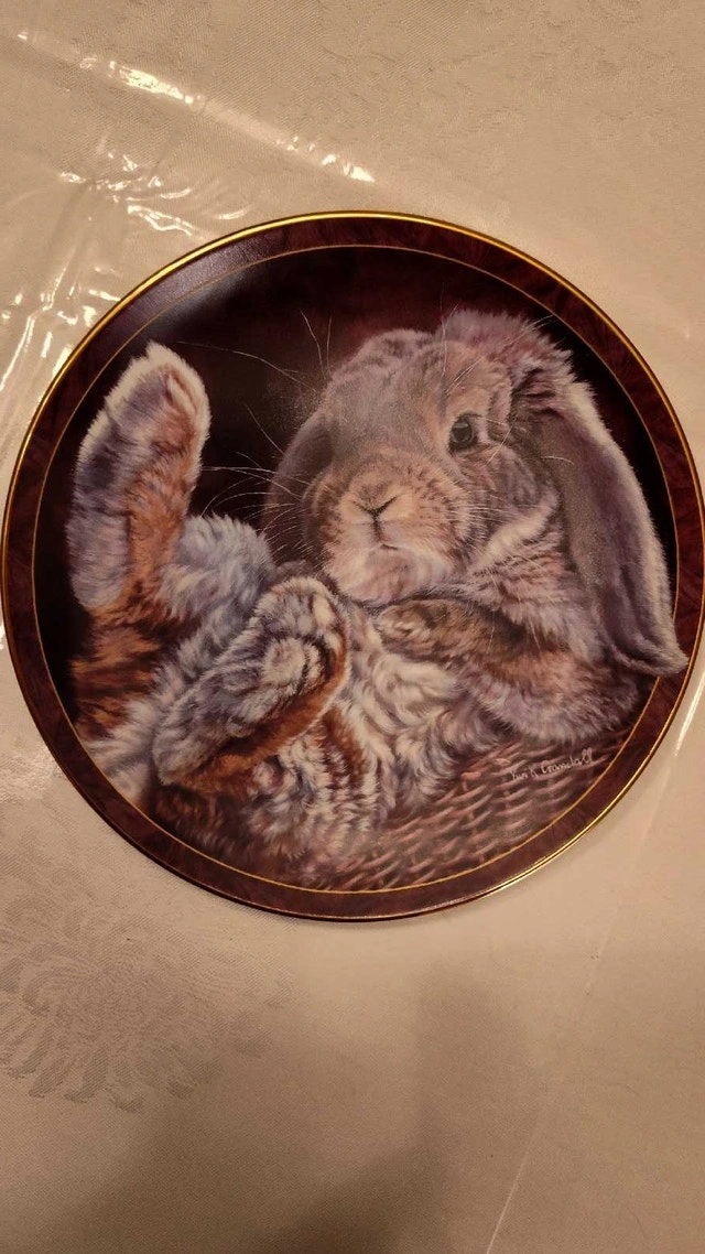 Just in time for Easter. Collectible plate featuring a cute floppy eared bunny. Part of the Bunny Tales collection. Hard-fire porcelain. Vintage 1997. Excellent condition with intricate detailing. Asking $45. Price is negotiable. Pick up in Lisgar area of Mississauga.