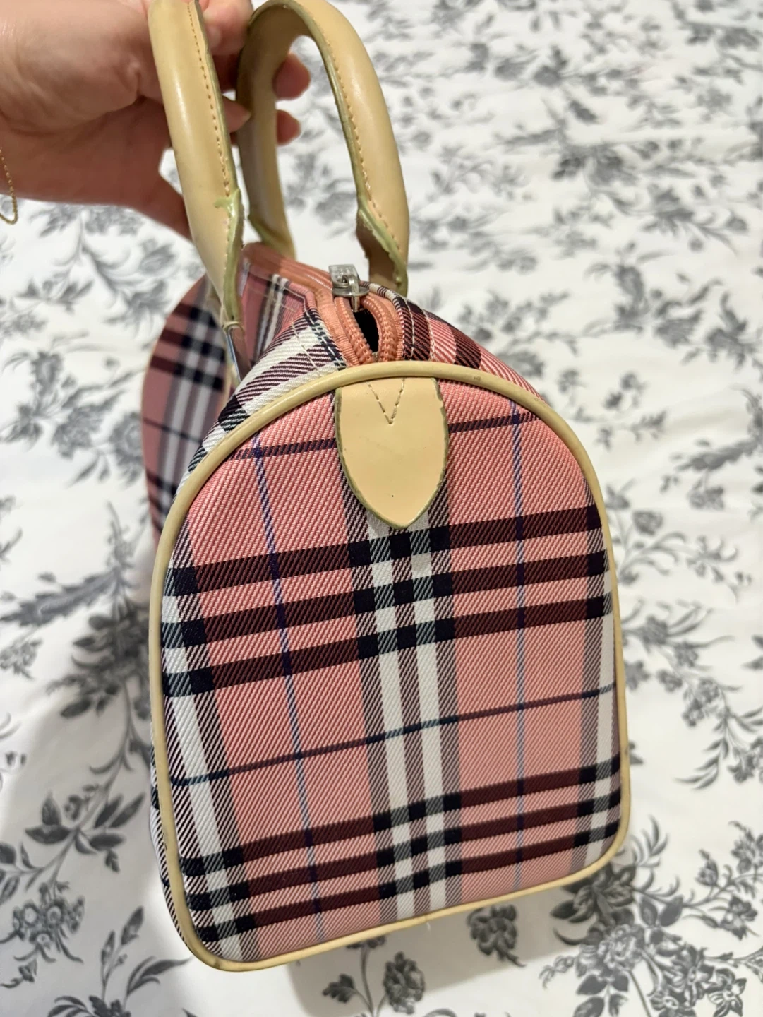 Burberry Pink plaid. This stylish satchel features a classic pink plaid pattern with leather trim and handles. It's a great size for everyday essentials. A lovely addition to your accessory collection!