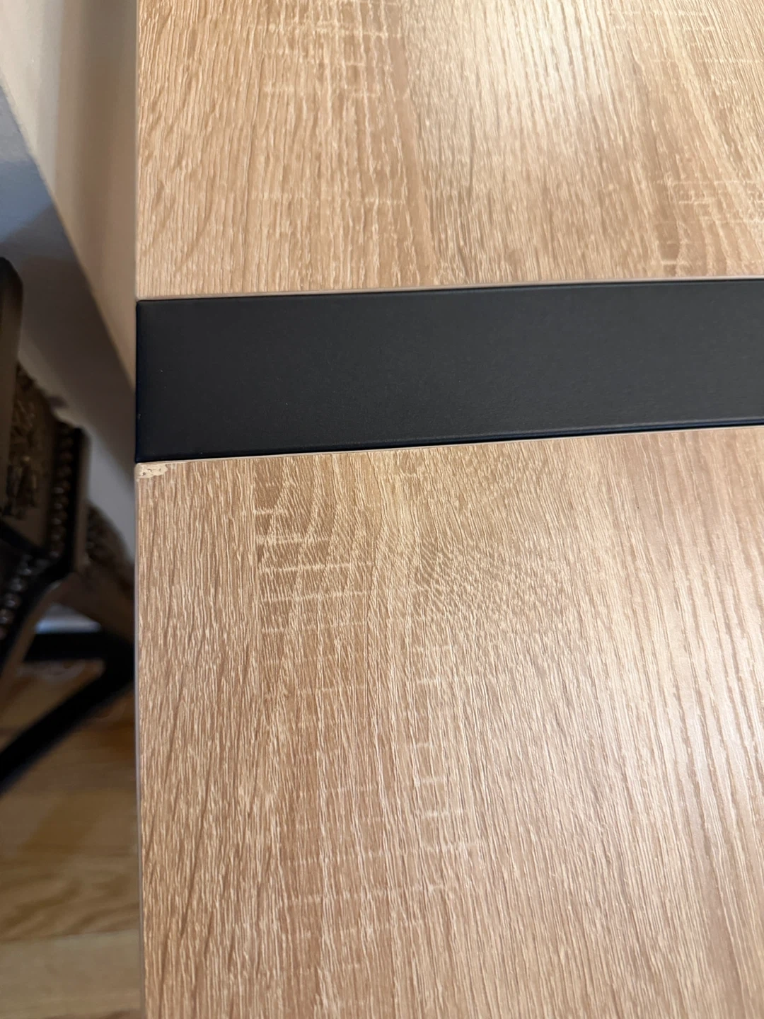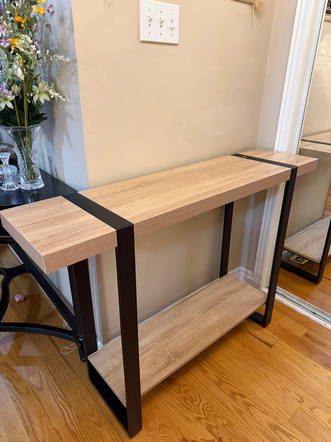 Brand New Console Table with Oak Finish and Black Metal Frame