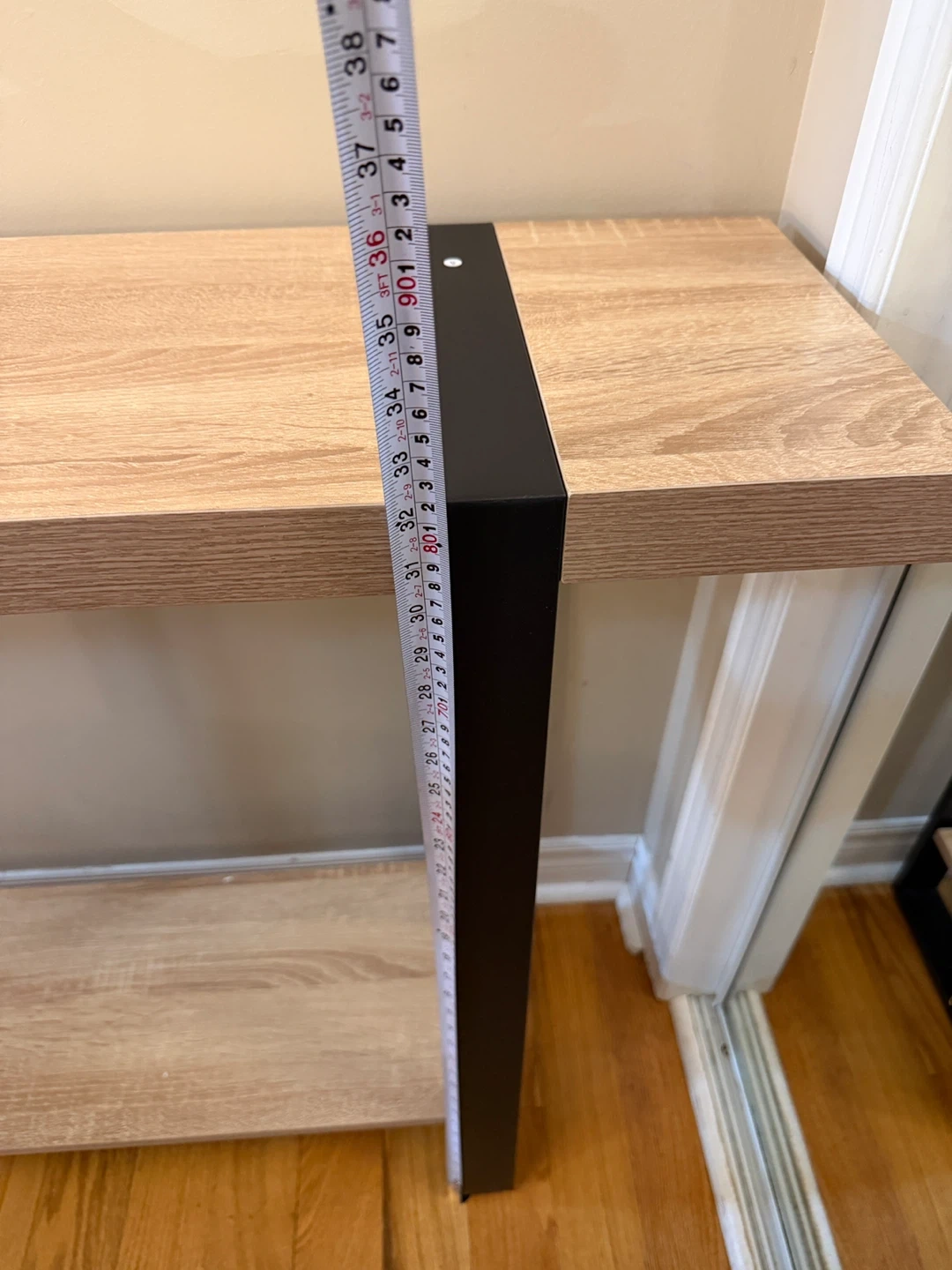This fully assembled new console table features a modern oak-look laminate top and shelves with a sturdy black metal frame. Its slim profile is perfect for entryways or behind a sofa. Measurements: Height is 32 inches, Depth is 12 inches, Length is 40 inches.
