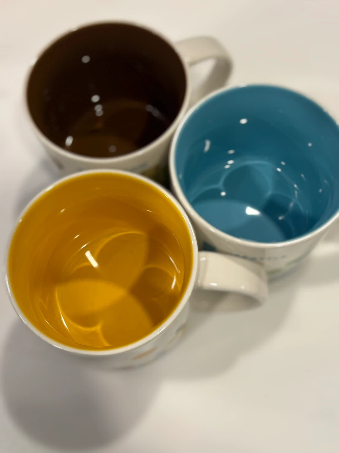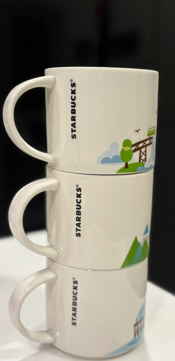 Three Starbucks "You Are Here" collection mugs from Edmonton, Seattle, and Orange County. Each mug features unique city skyline graphics and colourful interiors. They're dishwasher and microwave safe. some utensil marks