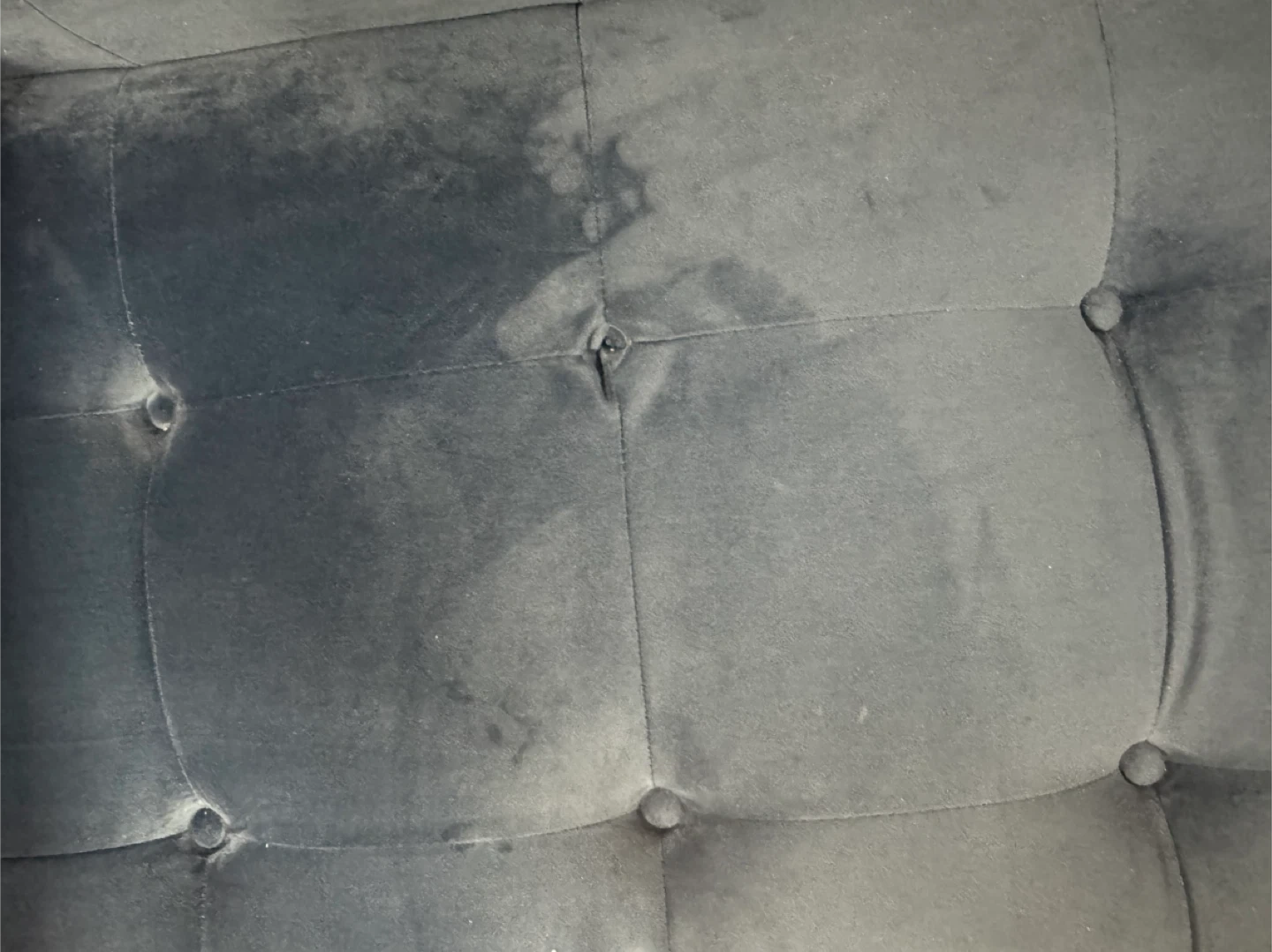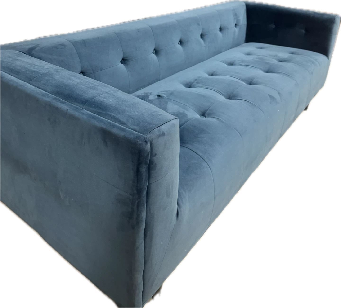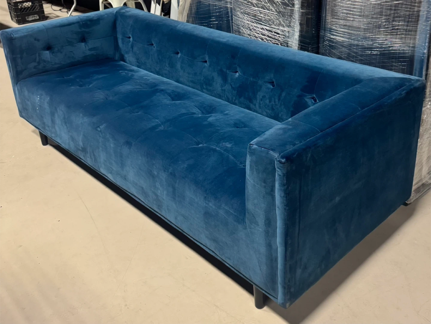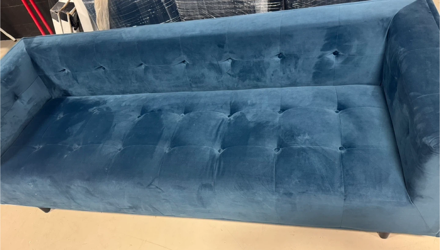 This stylish sofa is upholstered in a navy velvet fabric with deep button tufting. It features a modern design with clean lines and a comfortable seat. Great for adding a touch of elegance to any living space!