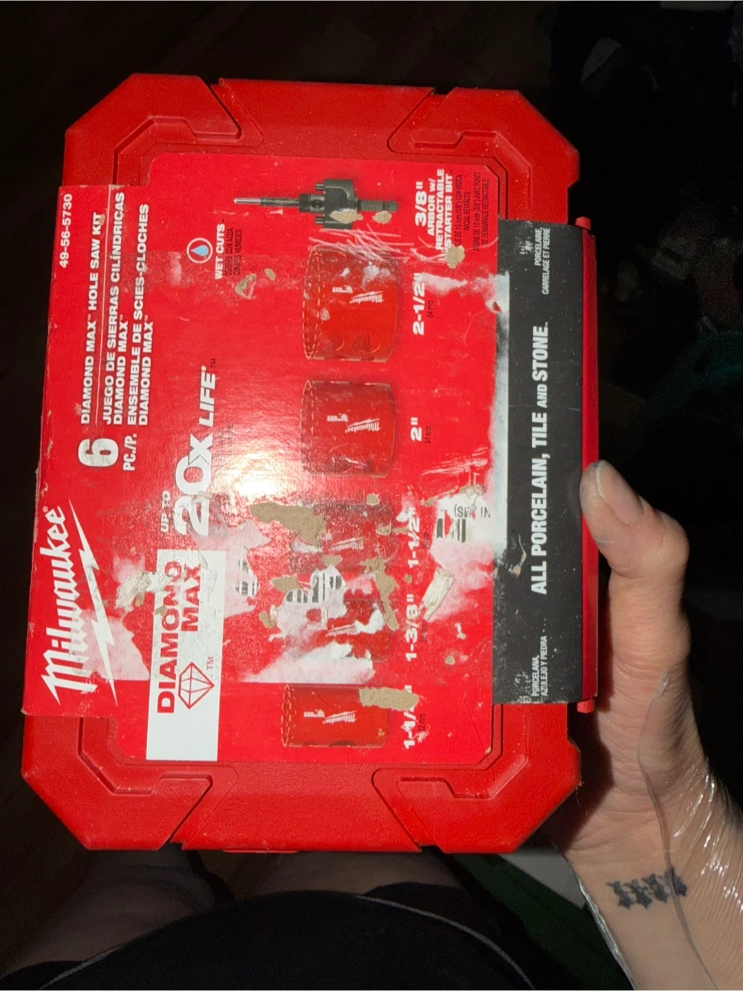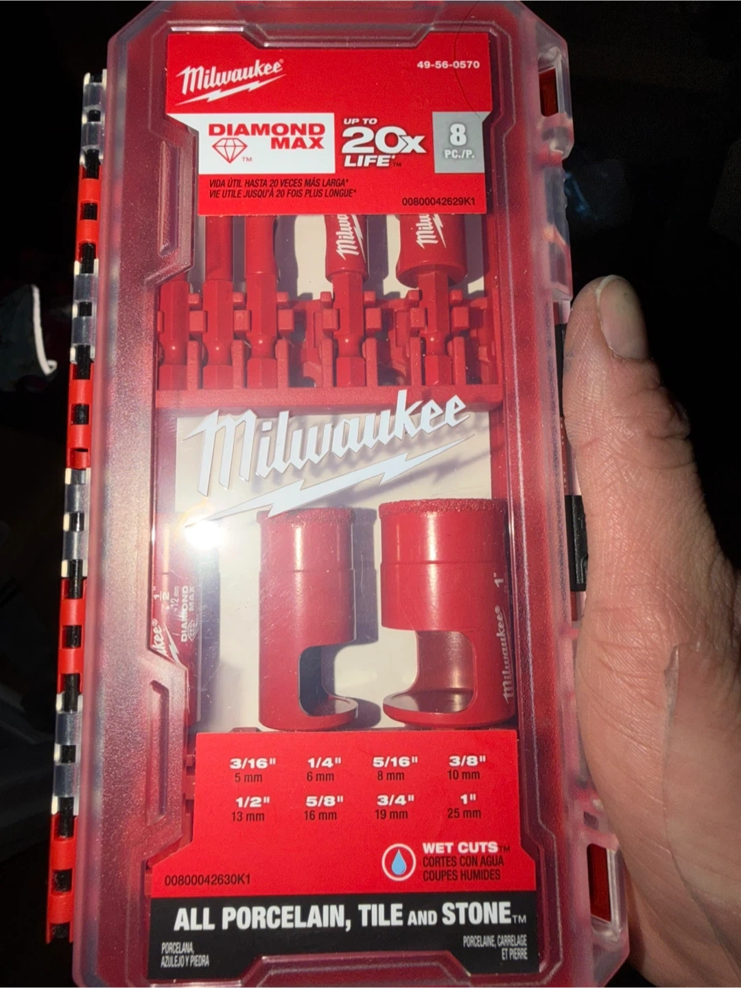 This is a 6-piece Milwaukee Diamond Max Hole Saw Kit for wet cuts. It includes various sizes suitable for porcelain, tile, and stone. The kit comes with a 3/8" retractable shank and includes cutters, a mandrel, and pilot bits.