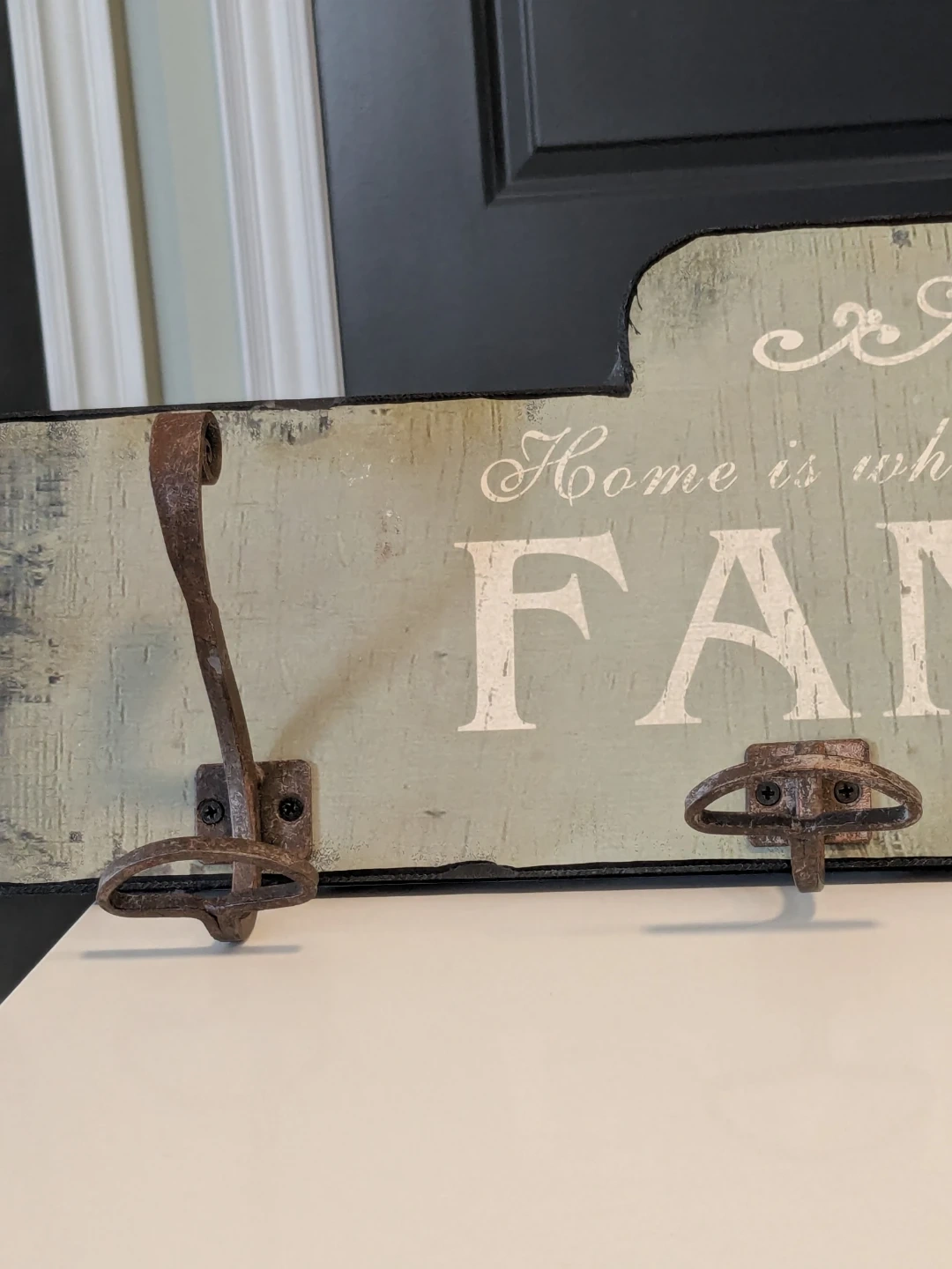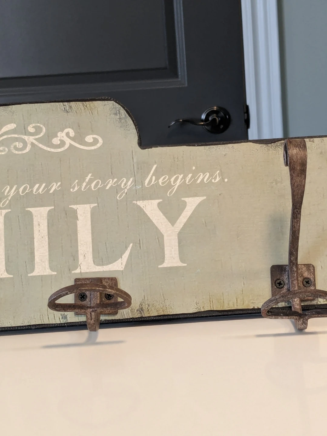 This decorative wall sign features the word "FAMILY" with the phrase "Home is where your story begins." It has four rustic metal hooks for hanging items. This piece adds a touch of charm and functionality to any entryway or living space.