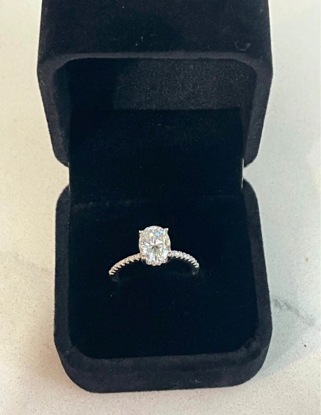 size 6,. Oval cut moissanite engagement ring with diamond accents. Comes with GRA Moissanite Report and original velvet box. Limited lifetime warranty included.