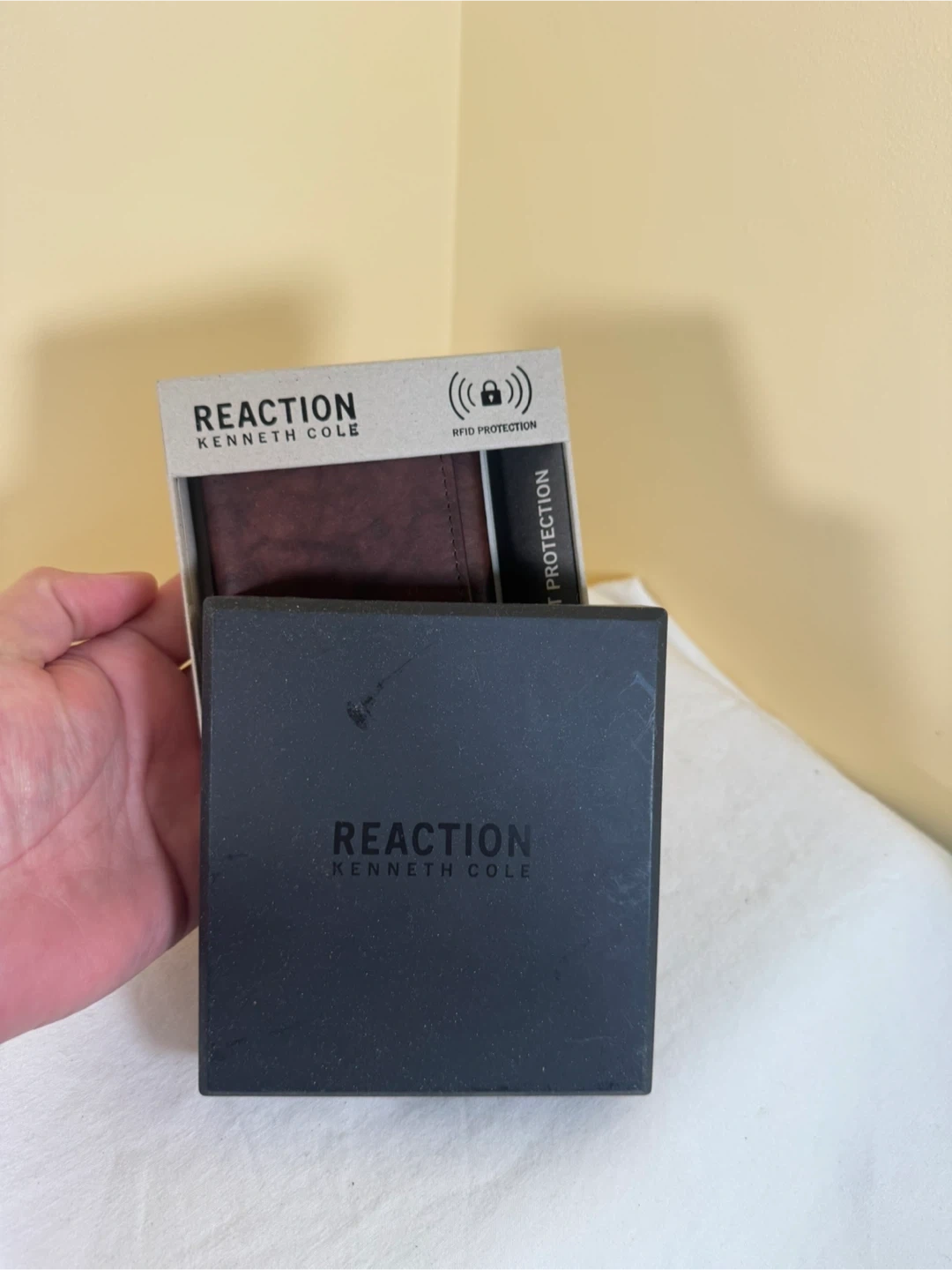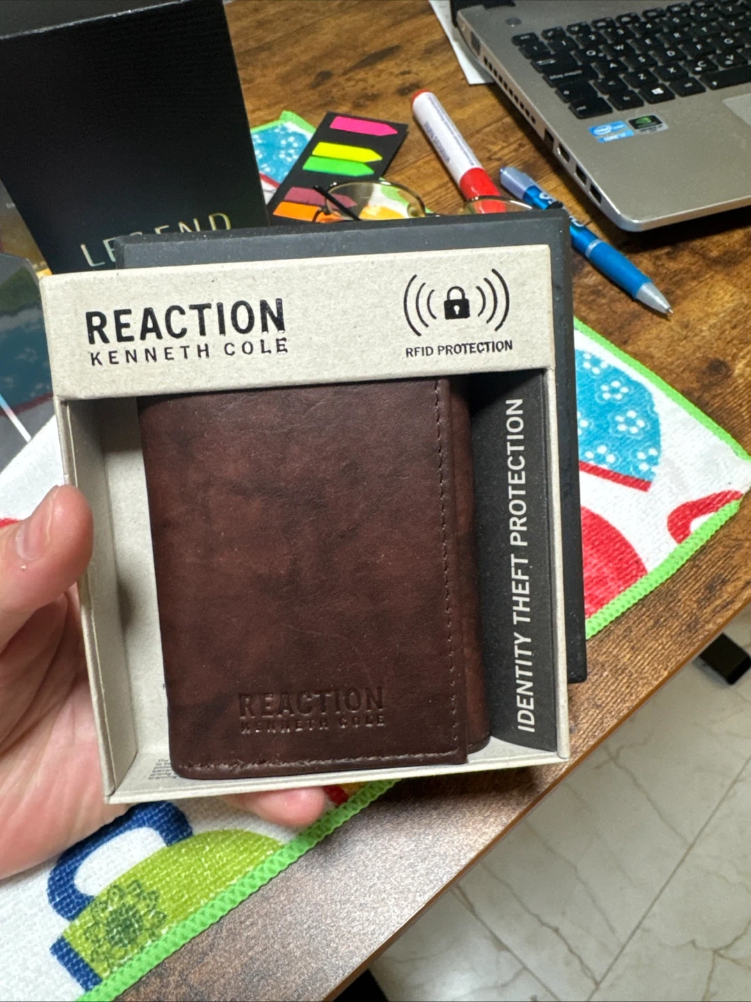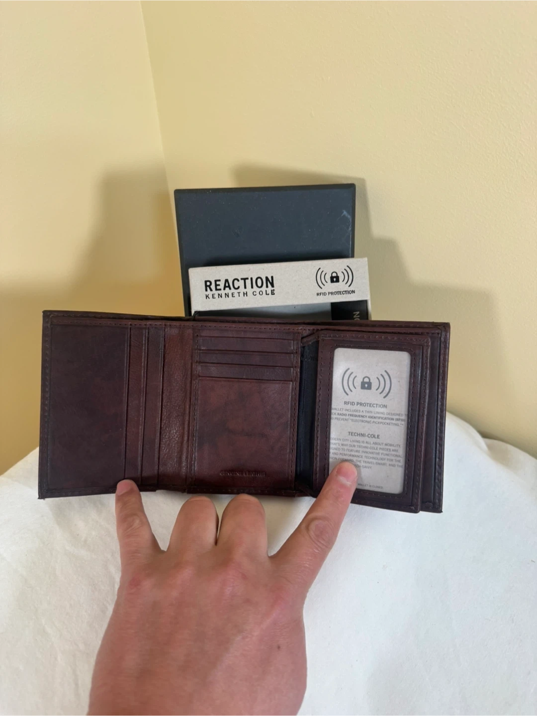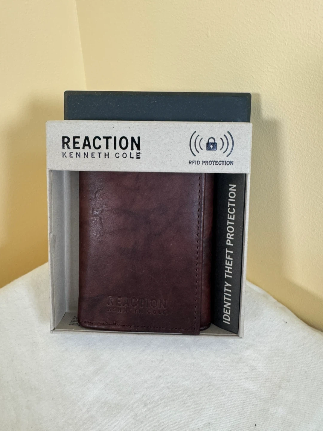 This Kenneth Cole Reaction wallet is made of brown leather. It's a trifold design with RFID protection to keep your information safe. Includes the original box.
