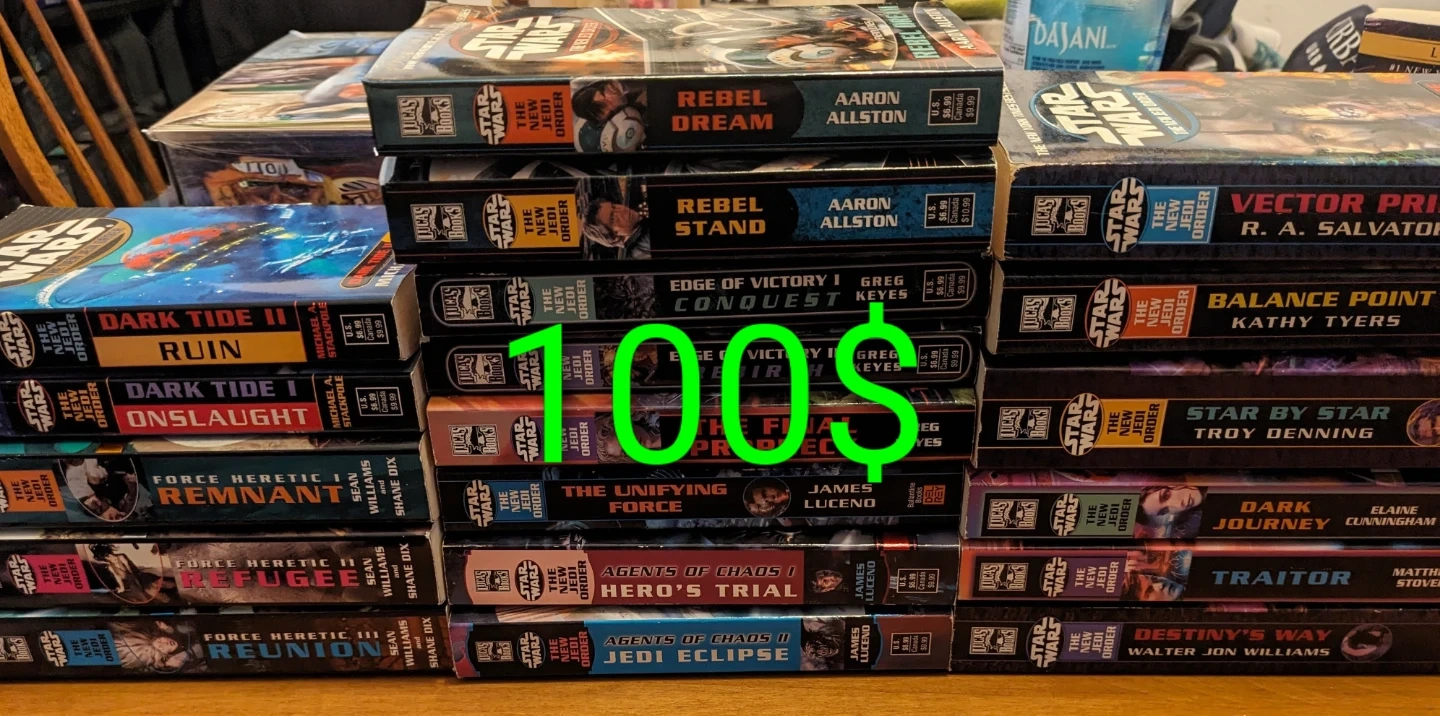 A collection of Star Wars: The New Jedi Order books. Includes titles such as Dark Tide II: Ruin, Force Heretic II: Refugee, and Star by Star.