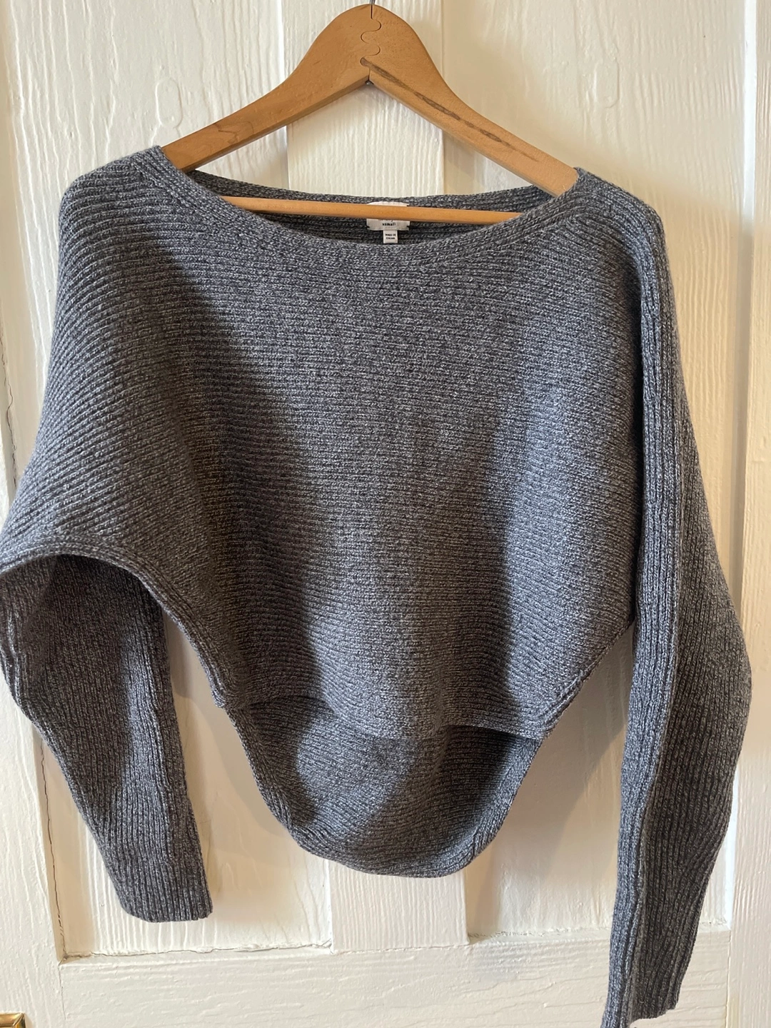 Women's XSmall grey knit sweater. 100% merino wool. Relaxed fit, cropped length. Long sleeves.