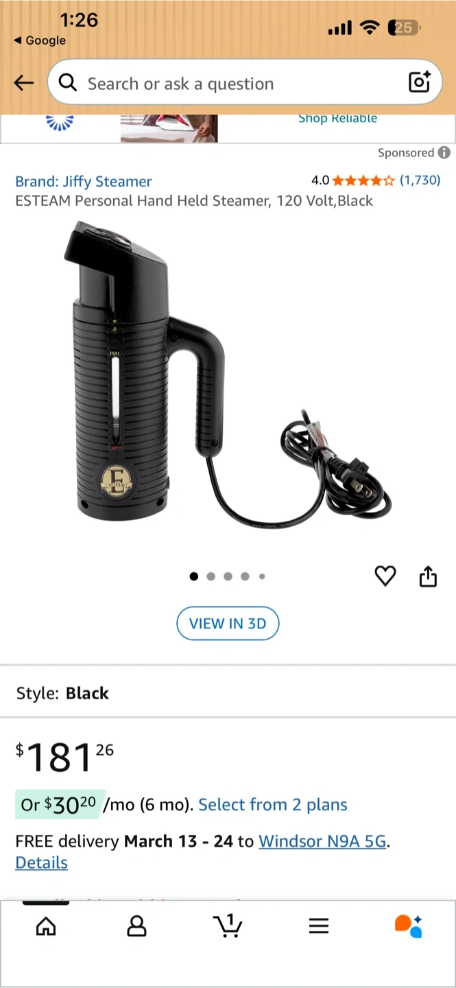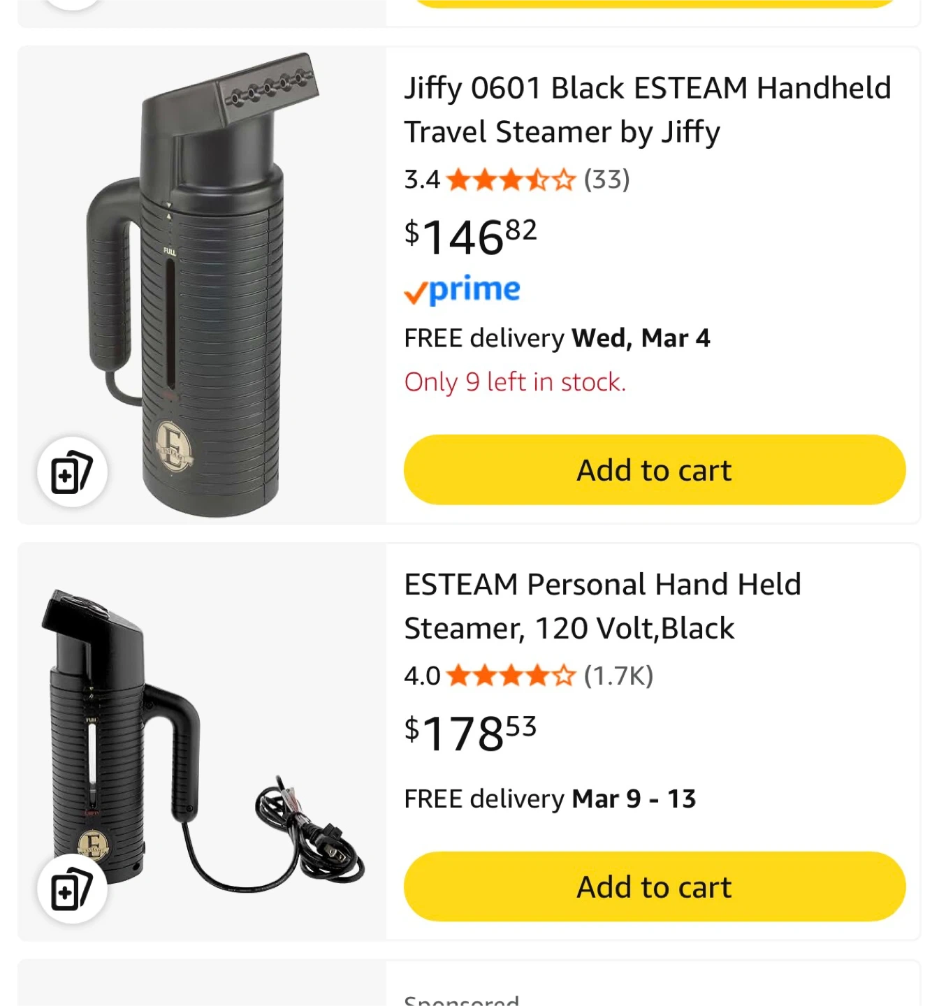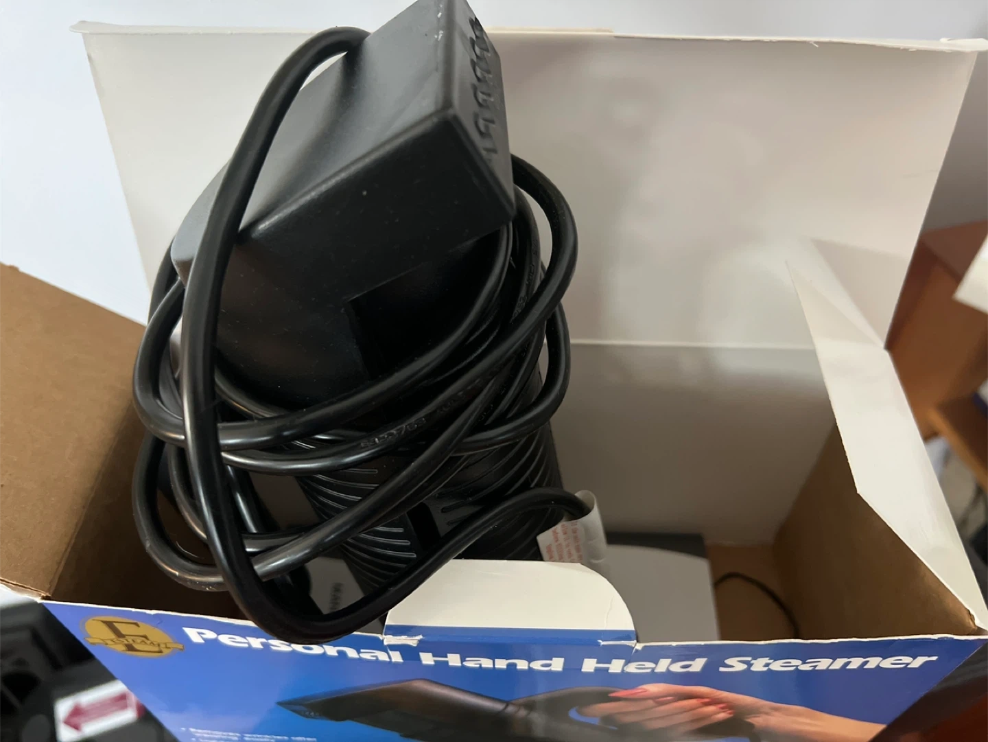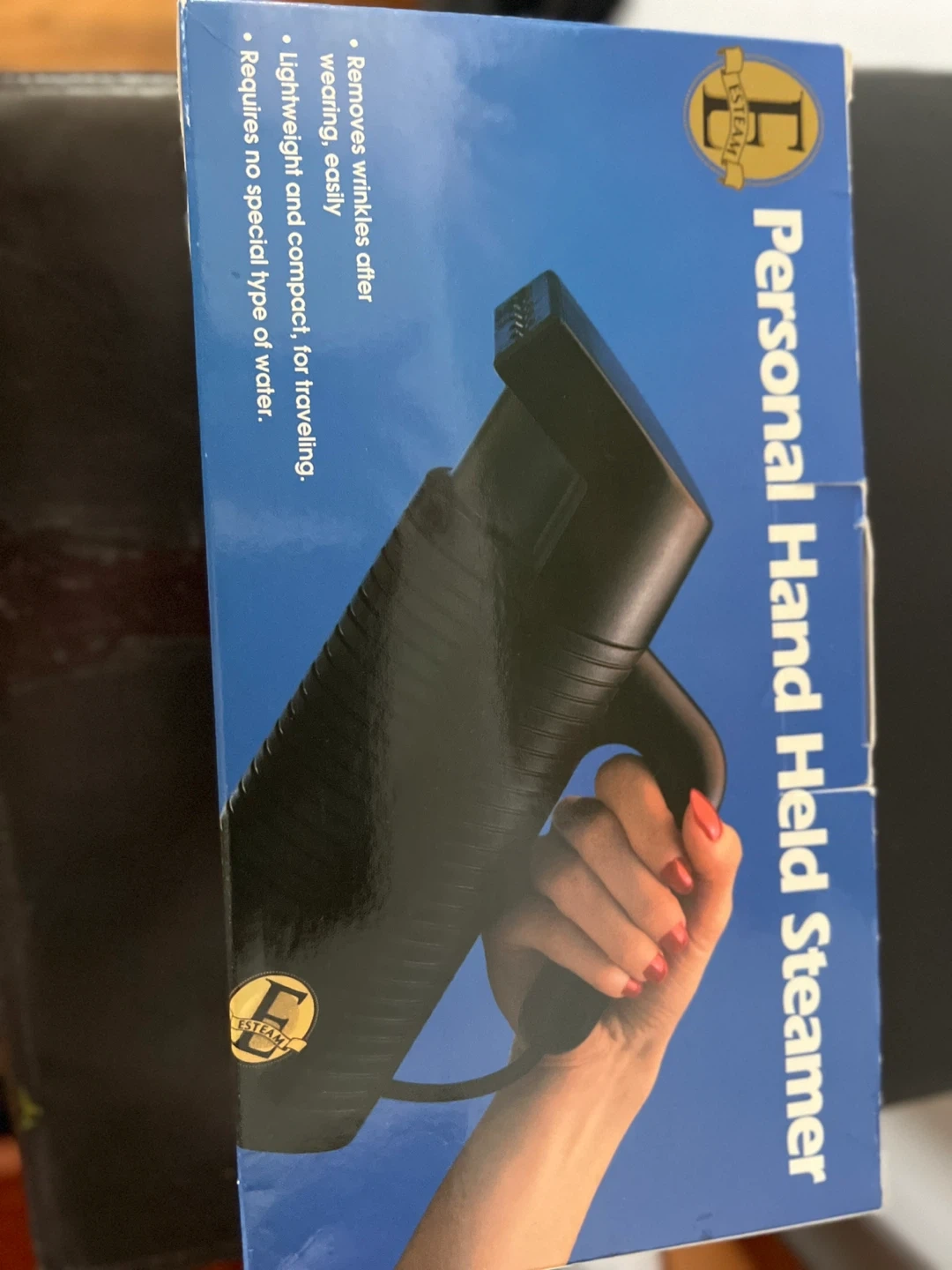 This ESTEAM personal hand-held steamer is lightweight and compact for travel. It removes wrinkles after wearing and requires no special type of water. This steamer is black and 120 volt. Sold on Amazon for over $100.00, high quality travel steamer, used only once