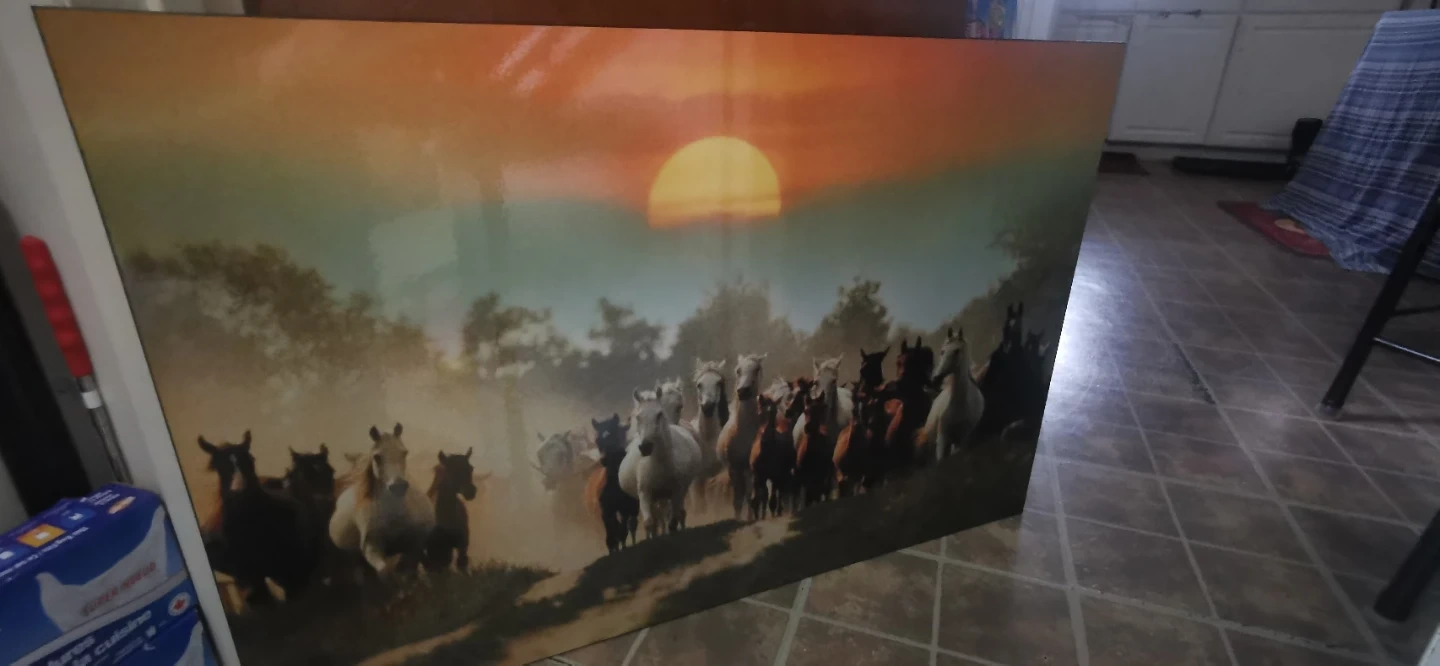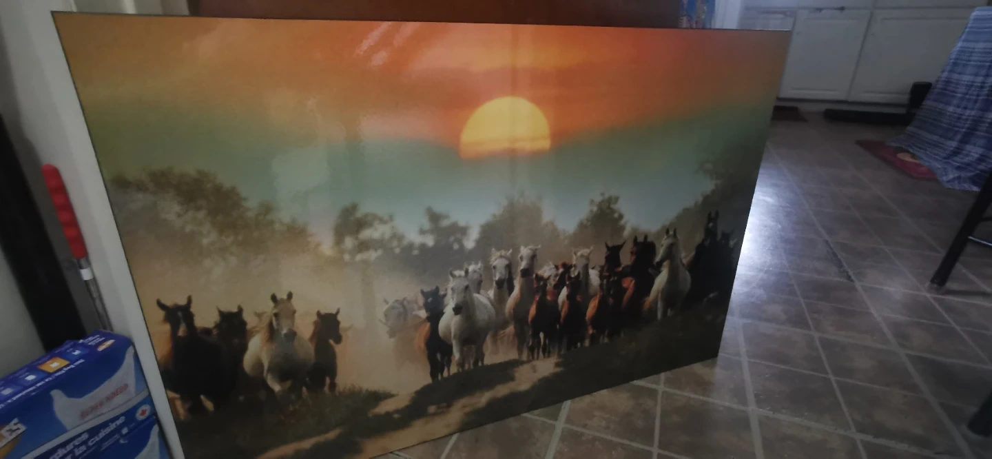 This large canvas depicts a herd of horses running during a sunset. It's a striking piece that adds a bold statement to any room. The vibrant colours and dynamic scene are sure to impress!