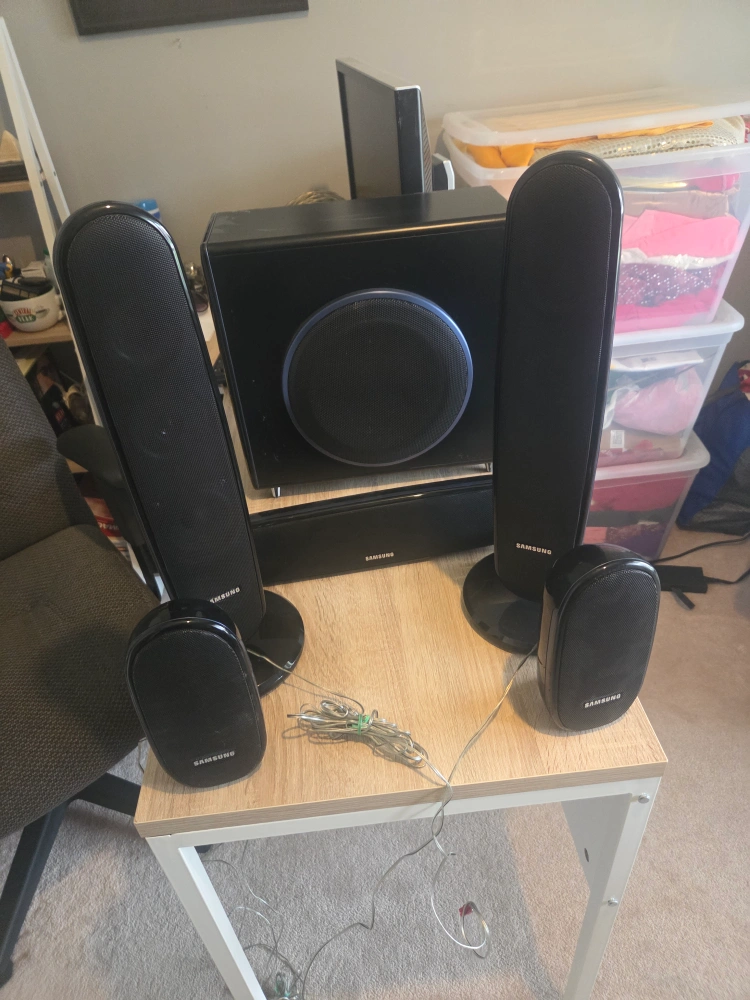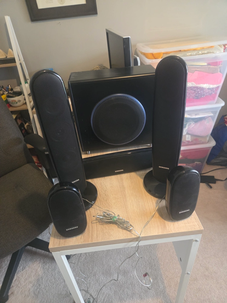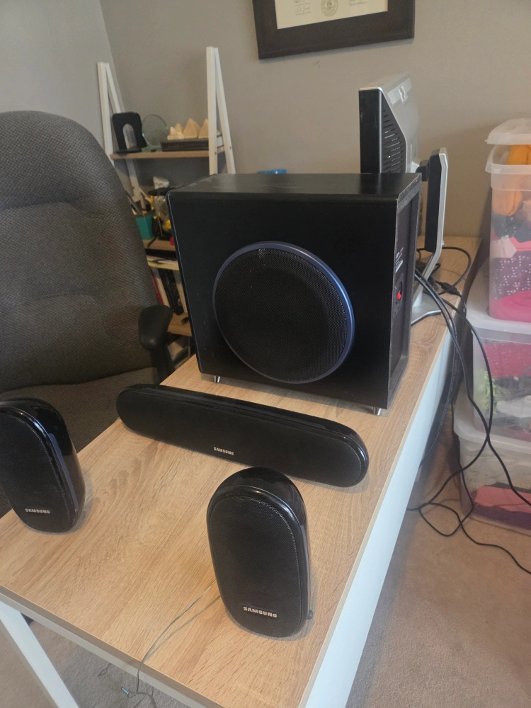 Selling a Samsung PS-WXQ100 subwoofer speaker system. It includes the subwoofer, sound bar, and four speakers. Great for enhancing your home theatre experience!