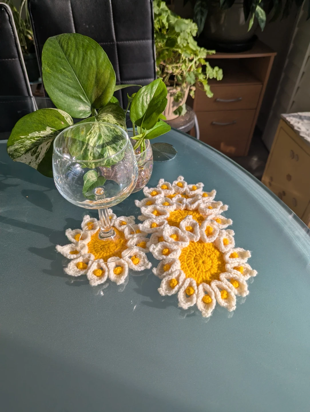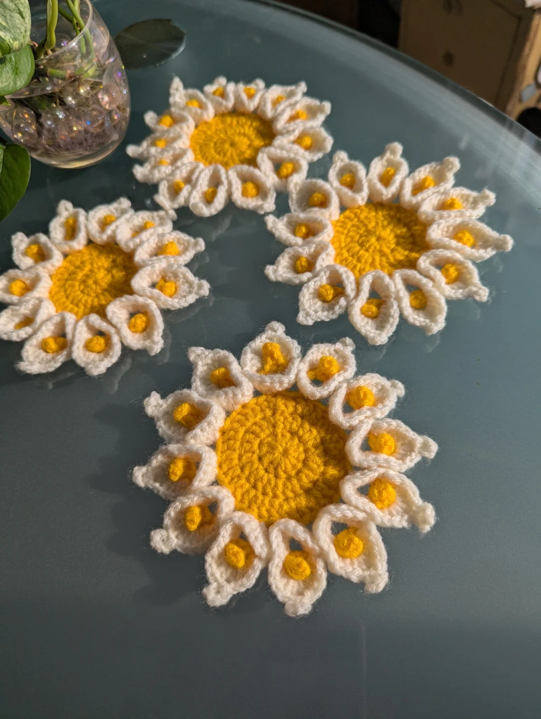 Here are four handmade crochet daisy coasters! They're perfect for adding a touch of sunshine to your coffee table or protecting your surfaces from drink rings. These coasters feature a cheerful yellow center surrounded by white petals, all lovingly crocheted by hand