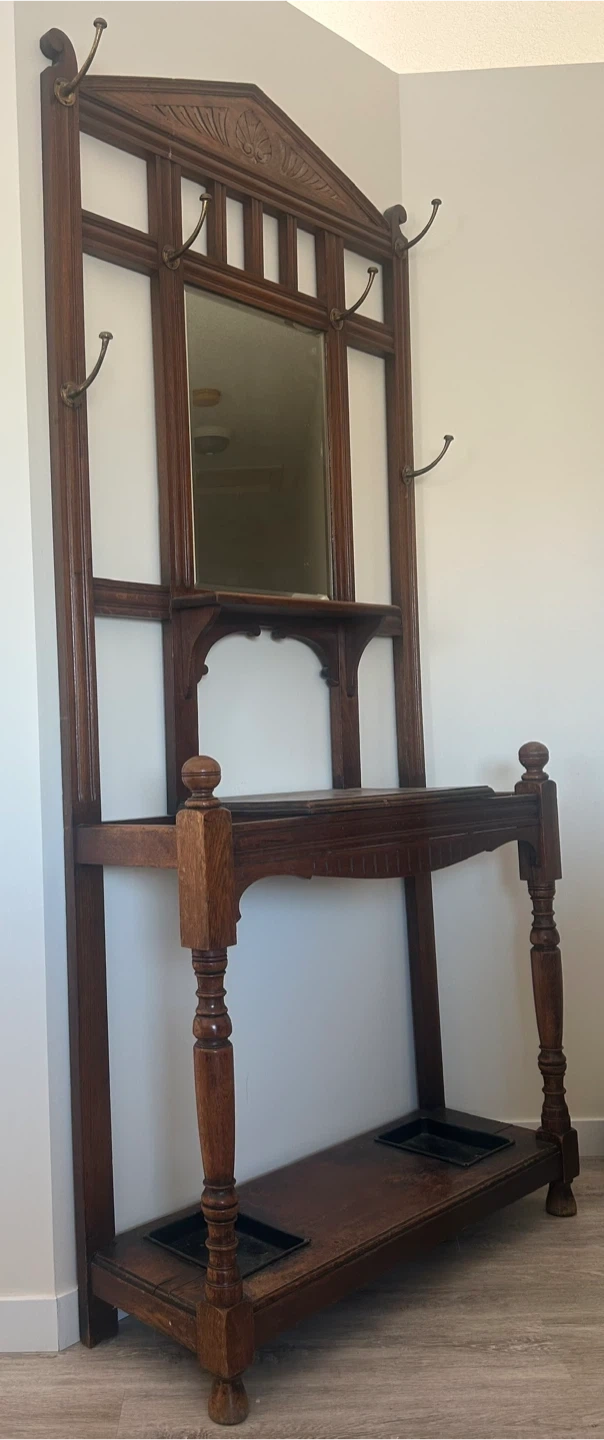 This vintage hall tree features a mirror, multiple coat hooks, and a convenient lower shelf. It has two integrated trays, perfect for holding umbrellas or walking sticks. A lovely addition to any entryway or mudroom!