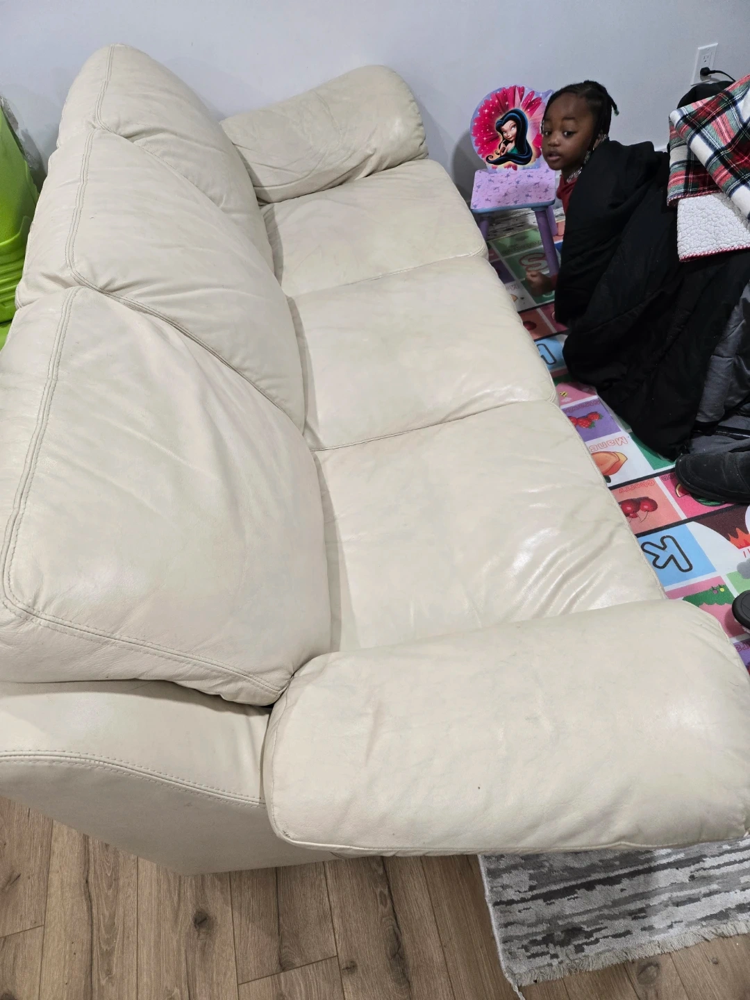 Cream-coloured leather sofa with three cushions and matching armchair. Plush seating and padded arms. This set's a comfy addition to any living space!