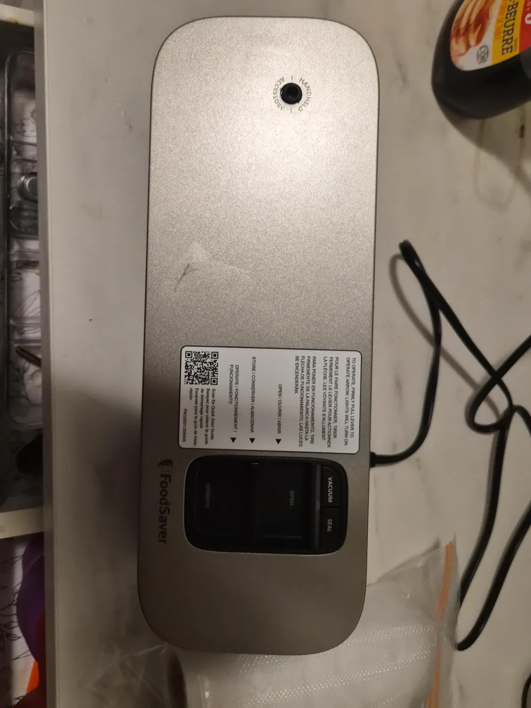 This is a FoodSaver vacuum sealer. It's a silver appliance with controls for vacuum and seal functions. Instructions for operation are printed on the unit. Including the vacuum sealed bags.