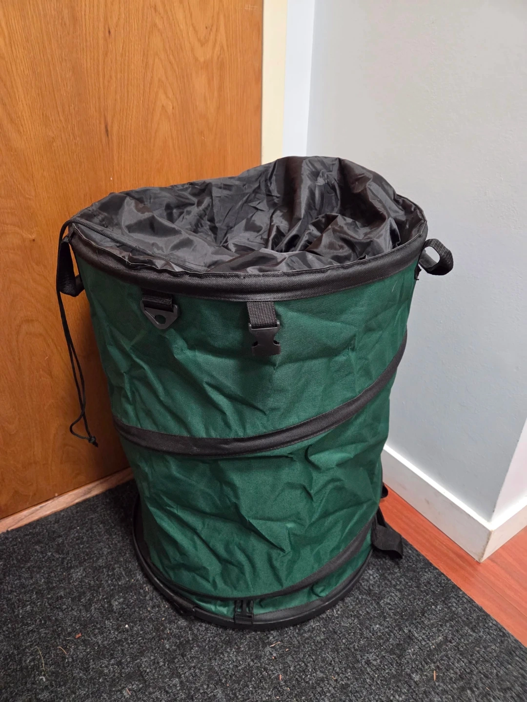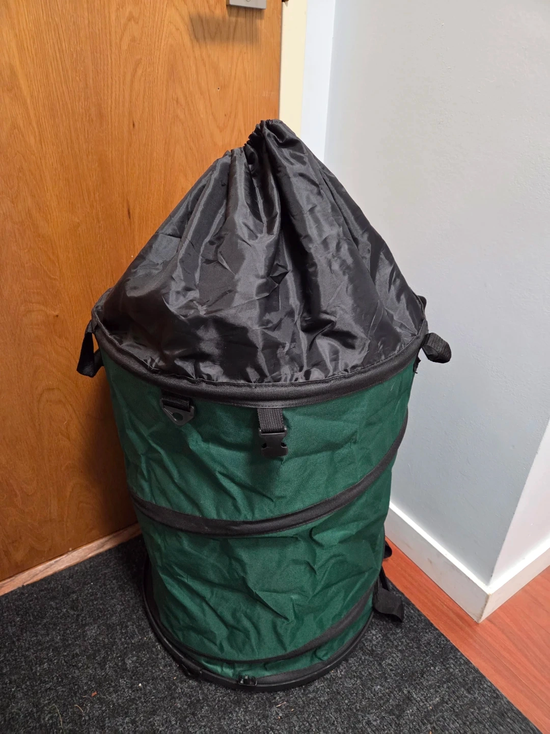 -Collapsible green storage or waste bin with a black drawstring top and carrying handles. It's made of durable fabric and folds flat for easy storage. Great for yard clean-up and gardening tasks!