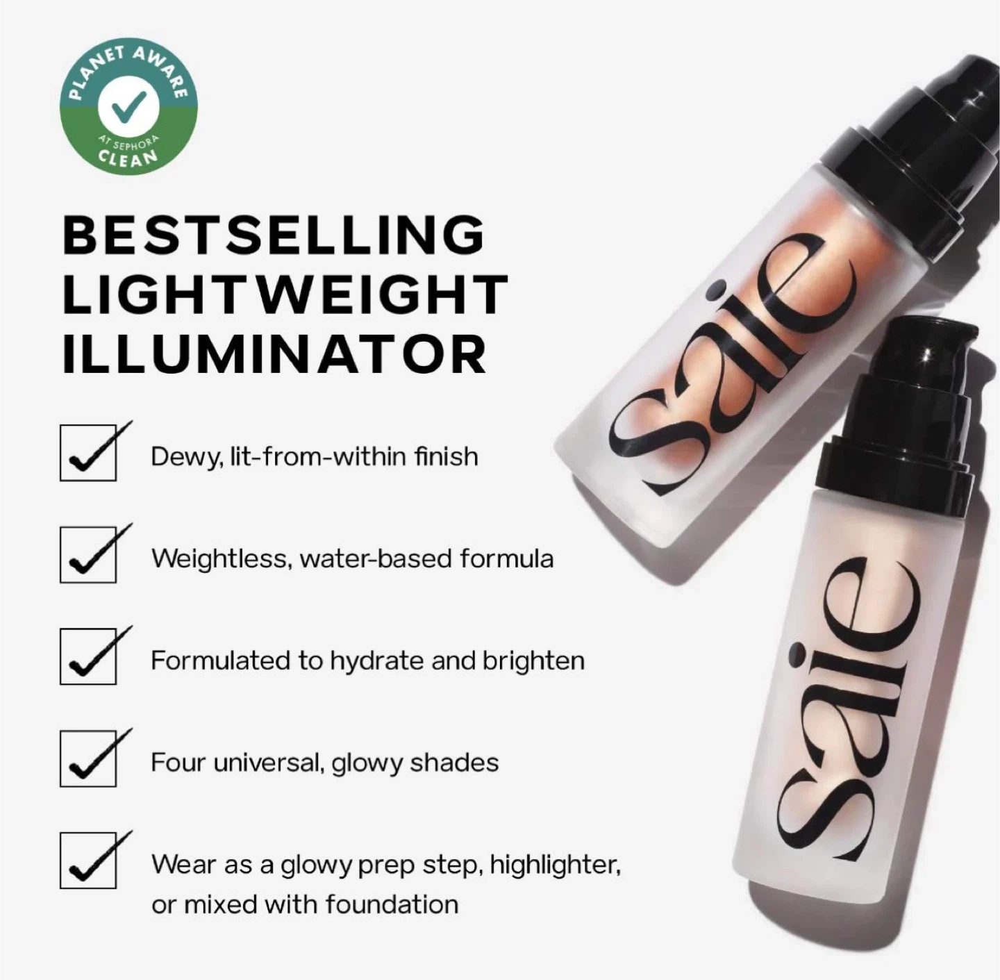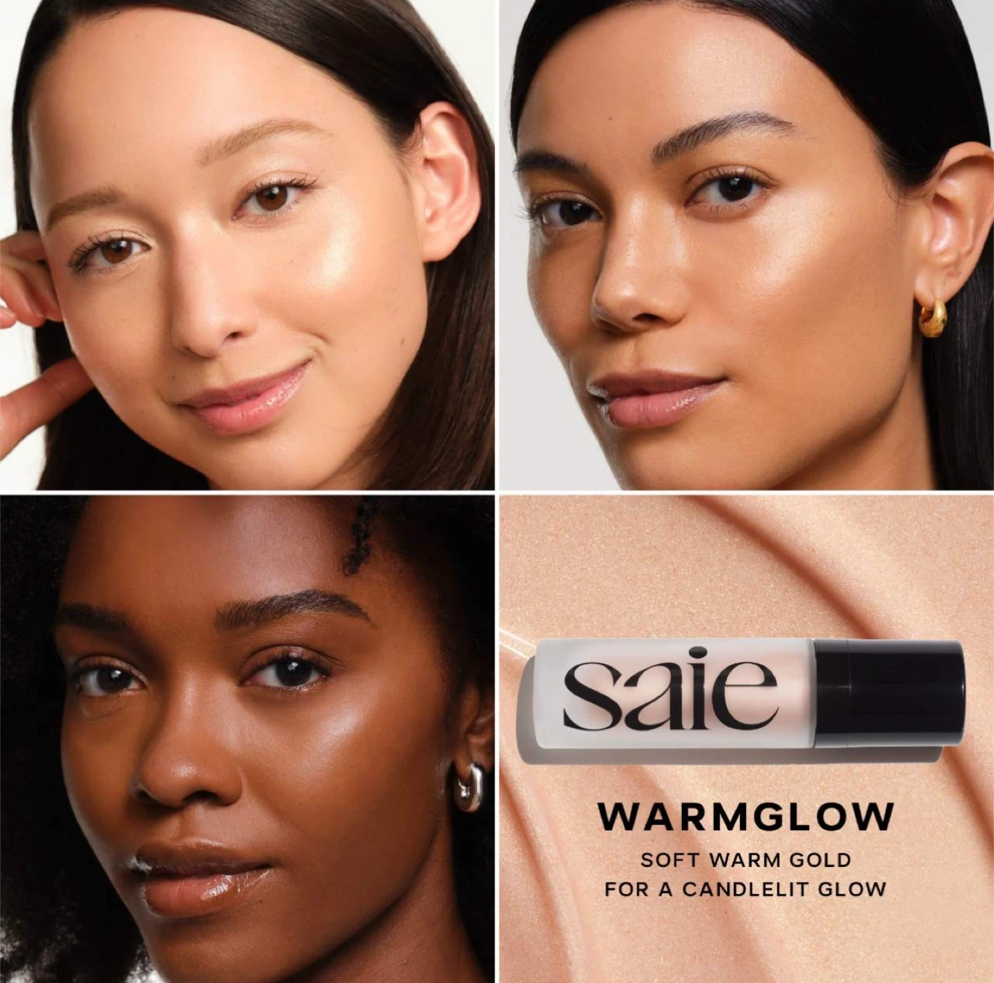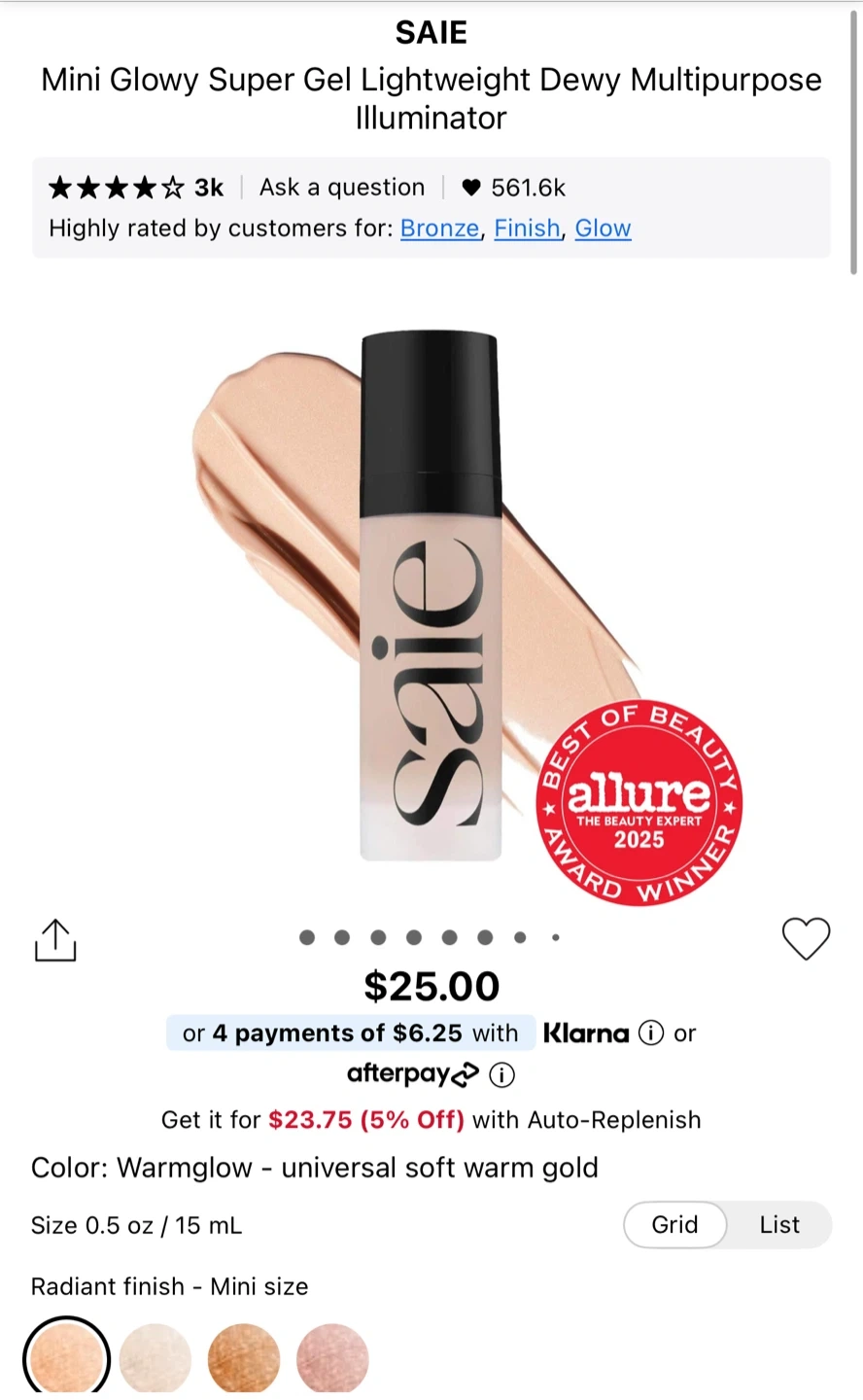 This is the Saie Glowy Super Gel Illuminator in the shade Warmglow. It's a mini size, 15 ml or 0.50 fl. oz., made in Italy. It provides a dewy, lit-from-within finish.