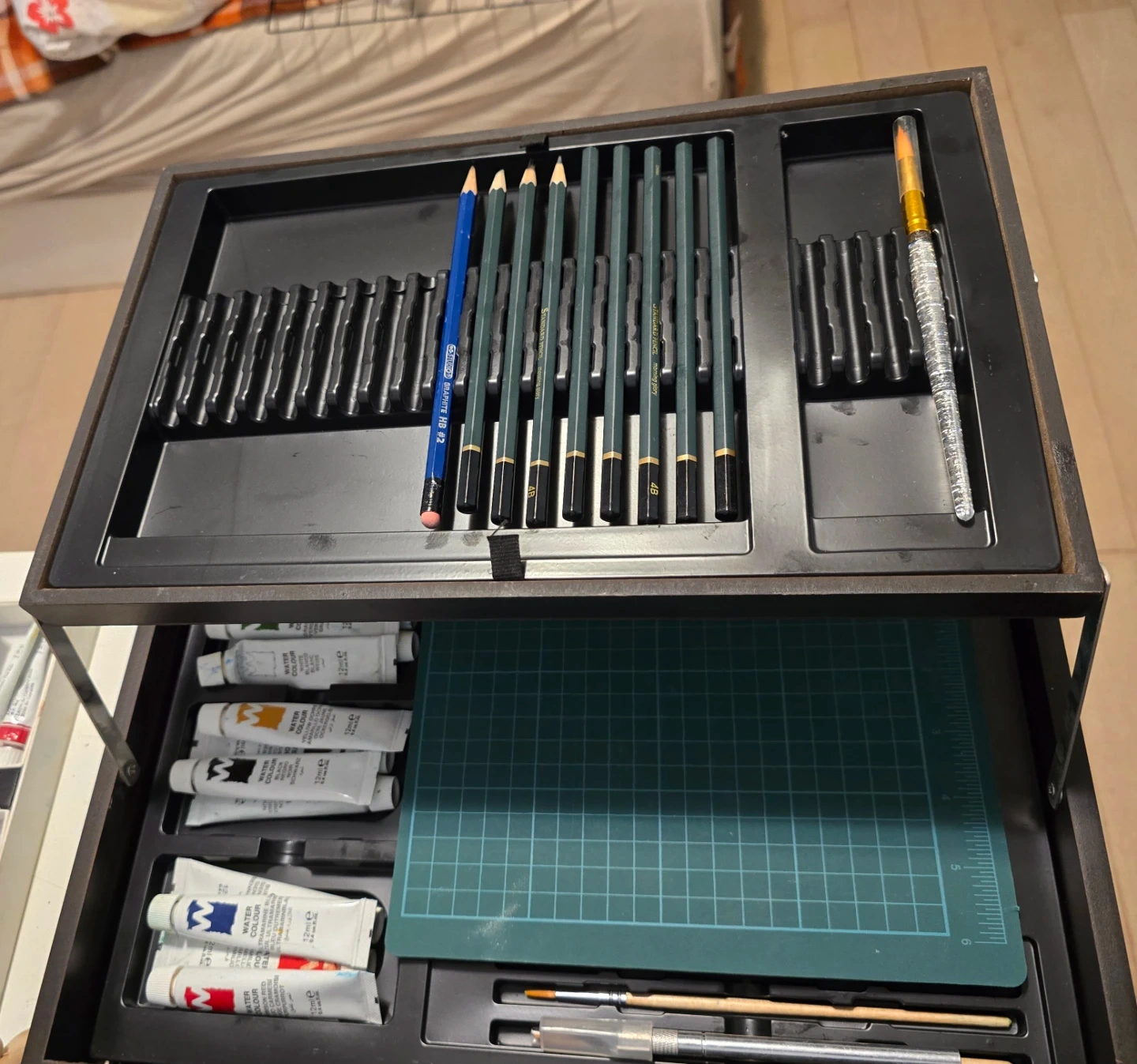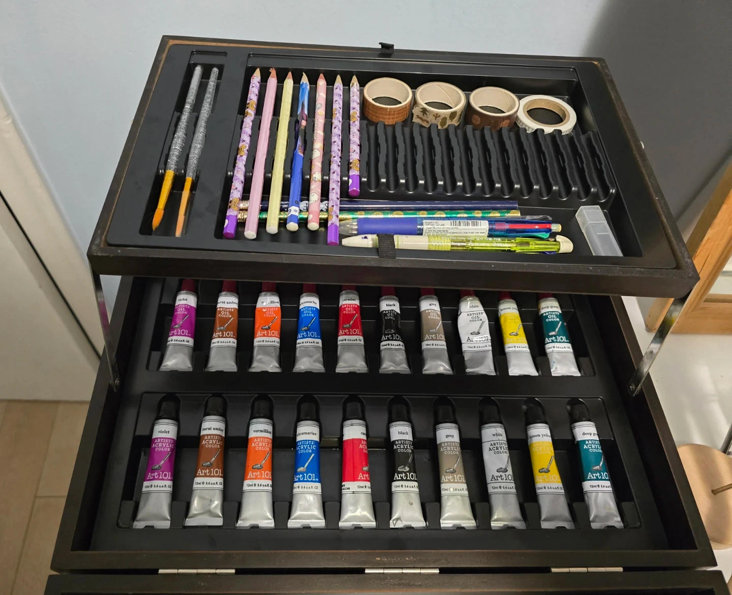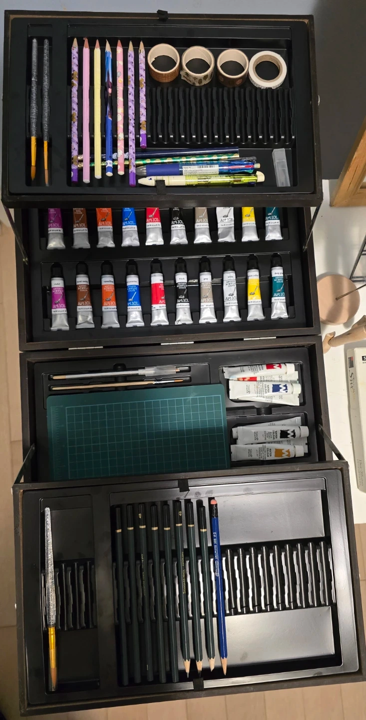 Art 101 Artist Suite in Wooden Case: Very clean and organized. Includes Oil/Acrylic paints, colored pencils, graphite pencils, brushes, and more.