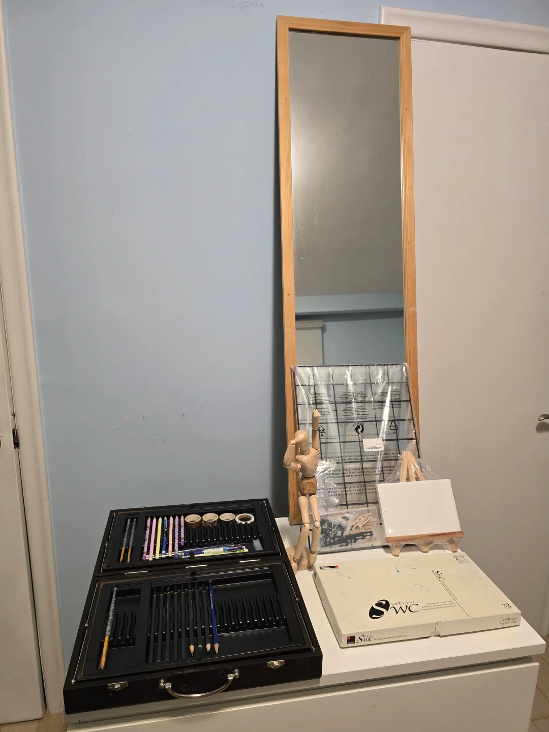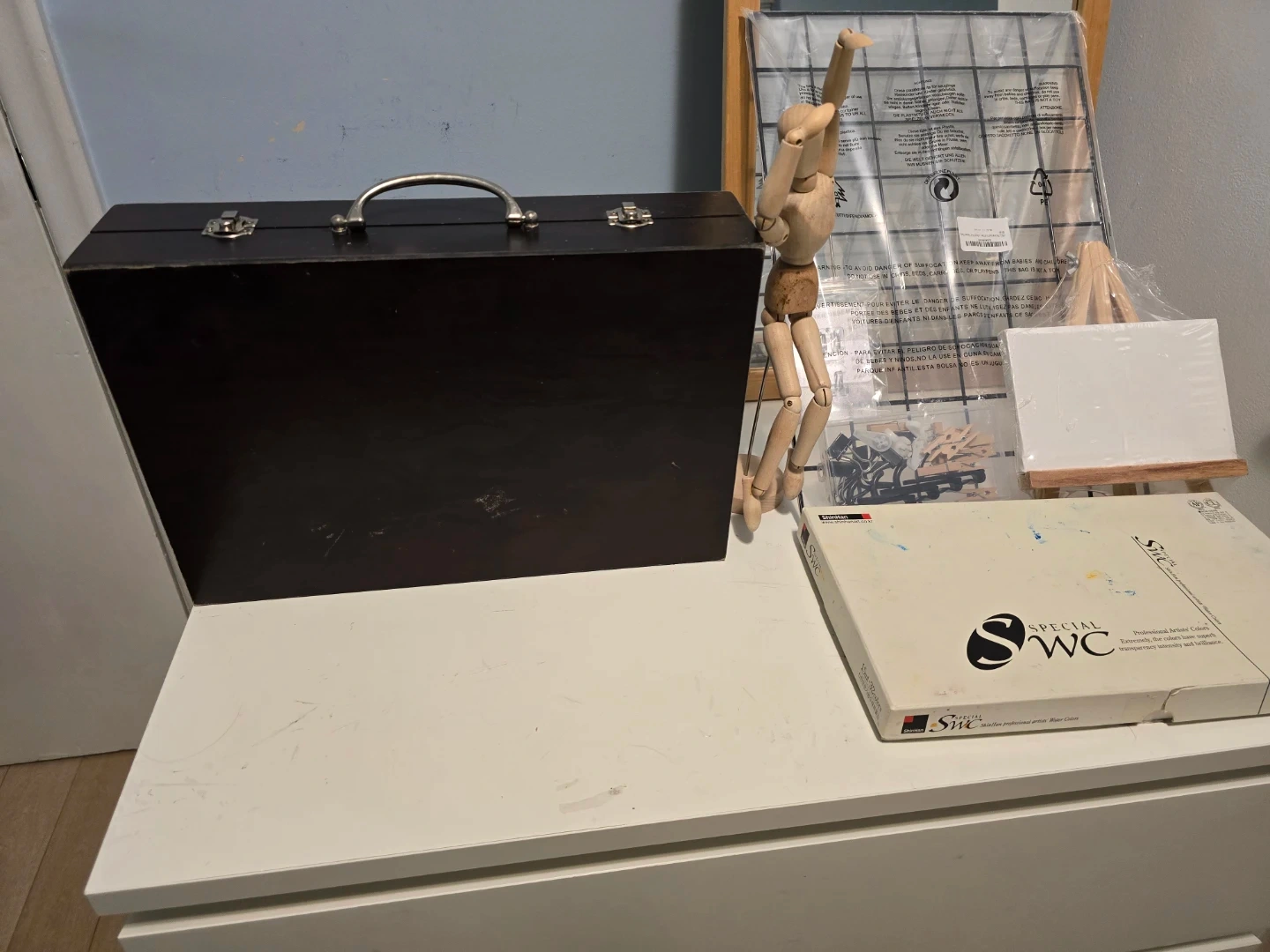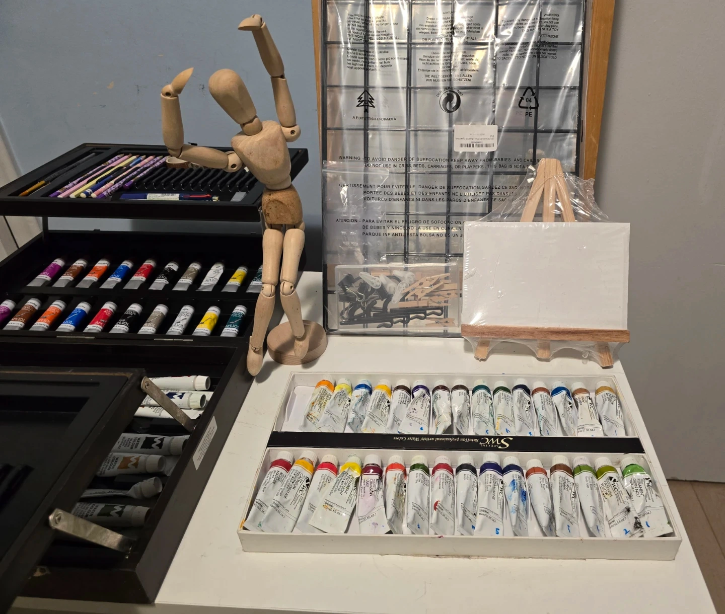 Essential Accessories: Wooden drawing mannequin, mini easel, small canvas, and a cutting mat.
