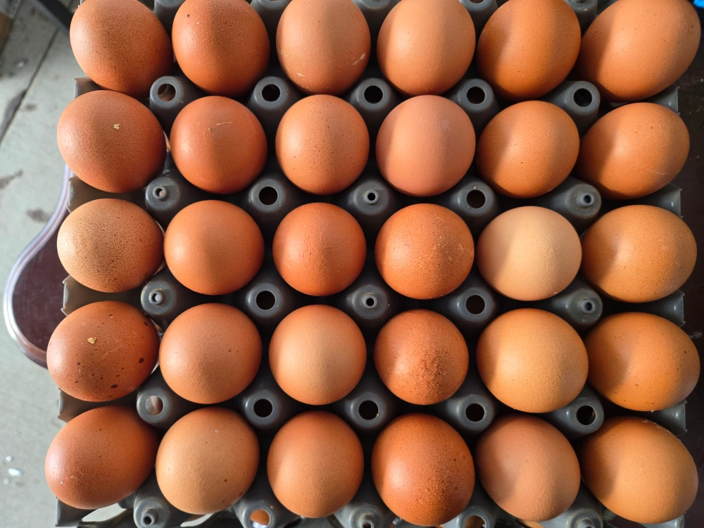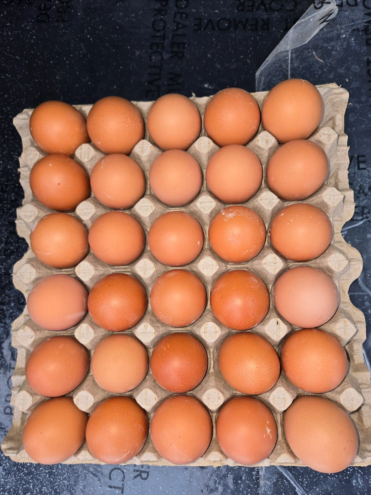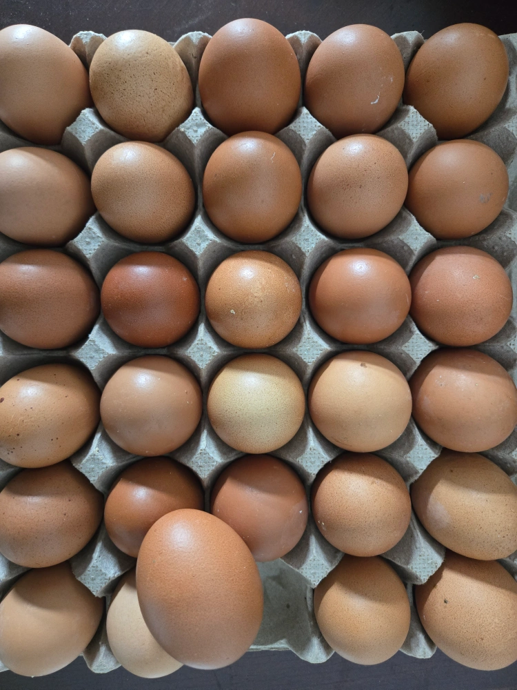 Thirty farm fresh brown eggs, ready for your kitchen. These eggs are from free-range chickens and are a lovely natural brown colour. They're perfect for baking, cooking, or enjoying scrambled!