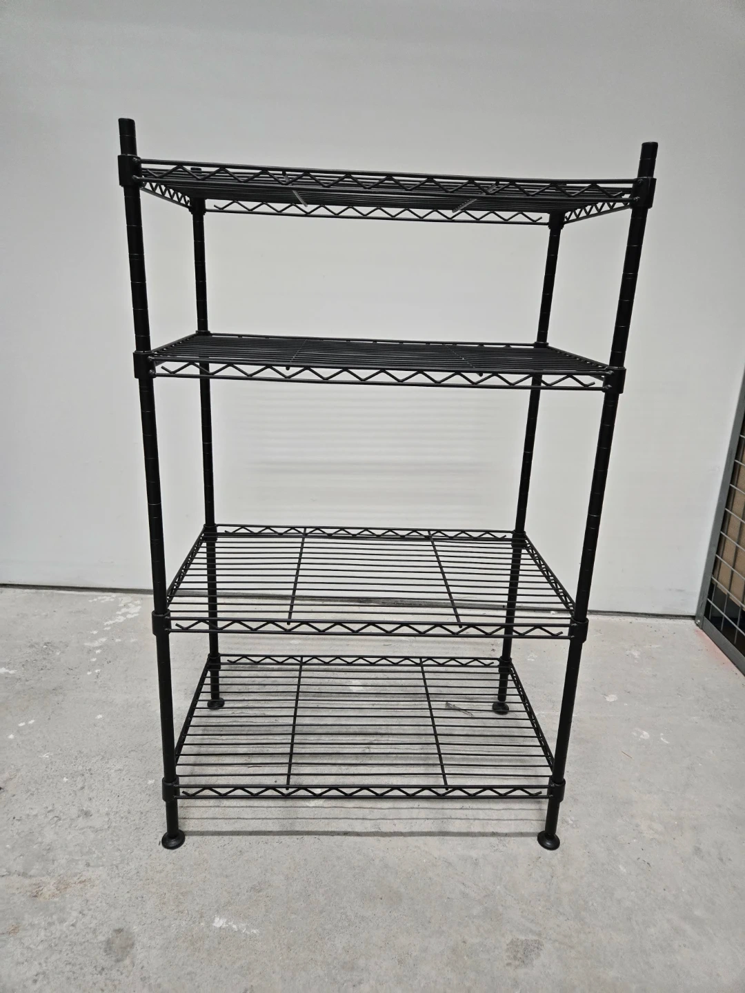 This is a black 4-tier wire shelving unit. It's made of durable metal and features adjustable shelves. The open design allows for easy access and good ventilation. It's handy for storage in a garage, kitchen, or workshop!