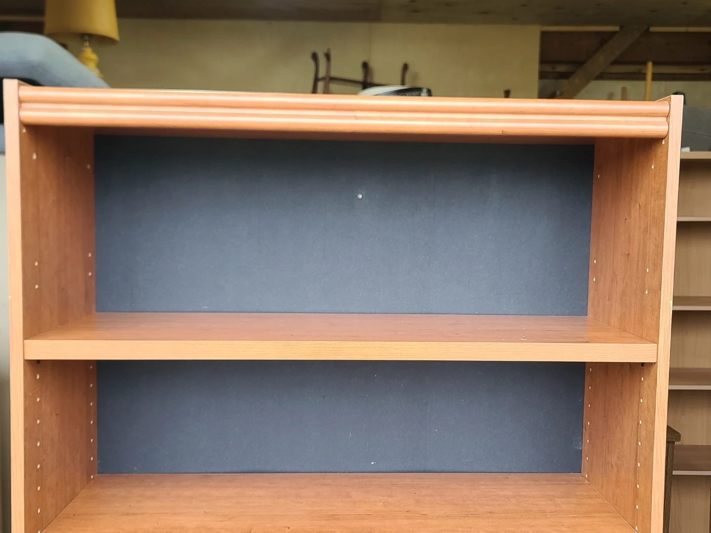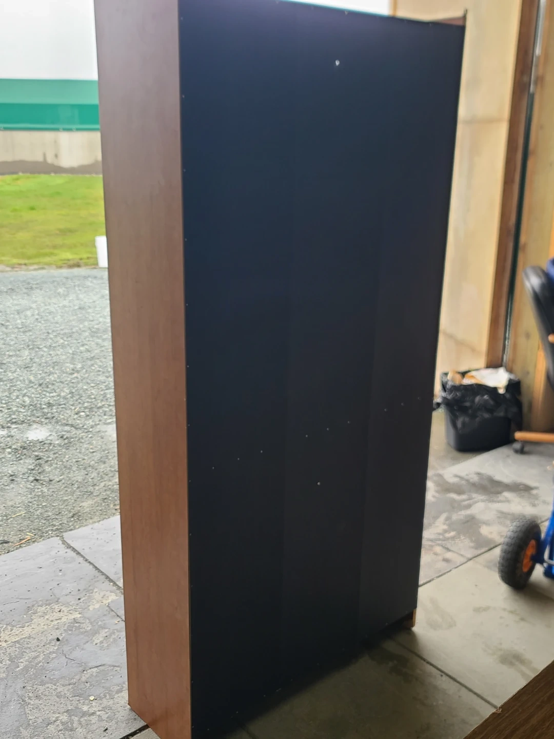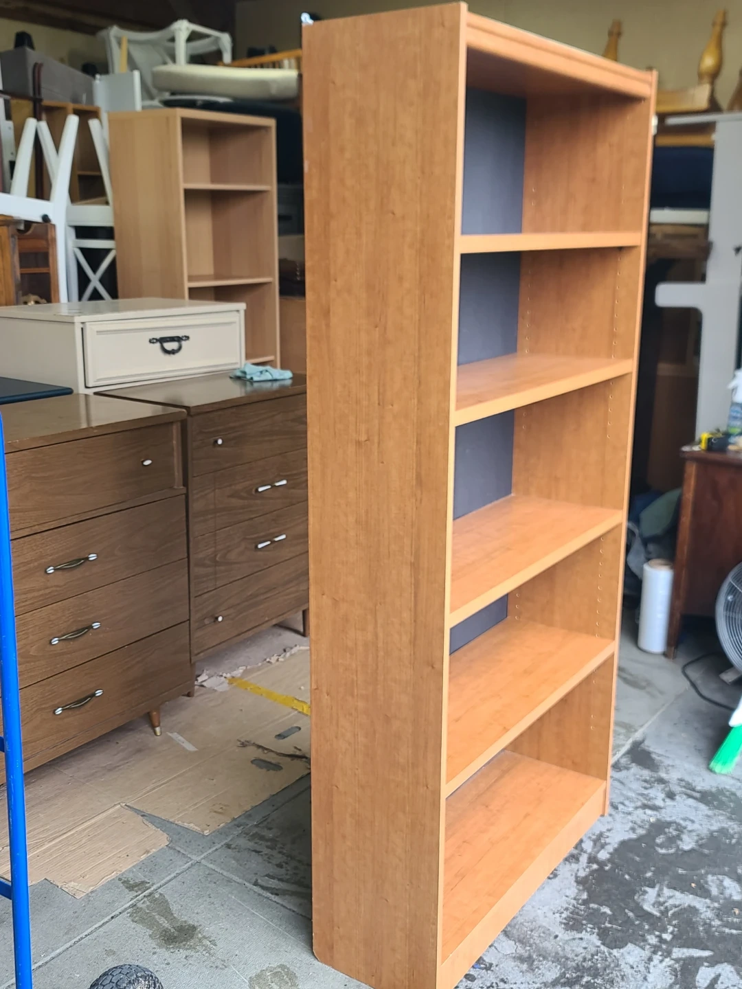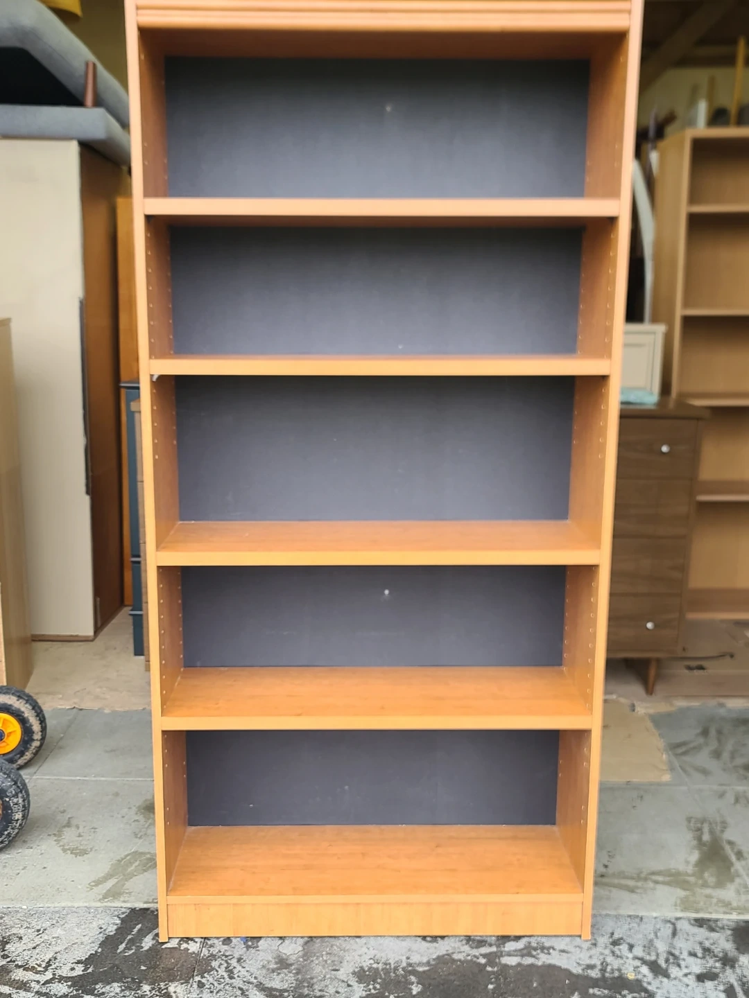 Sturdy wood grain laminate bookcase has five spacious shelves. Unit features a contrasting dark grey back panel and adjustable shelf heights. Primary color is a warm medium oak tone. Measurements: W 35" X D 12" X 72". Delivery can be arranged.viewing and pickup by appointment.