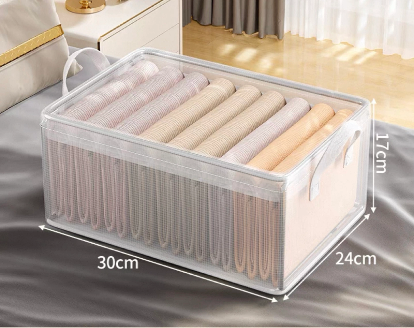 Neatly organize your clothes. Durable fabric construction. Clear see-through design. Convenient carrying handles. Dimensions: 30cm x 24cm x 17cm.